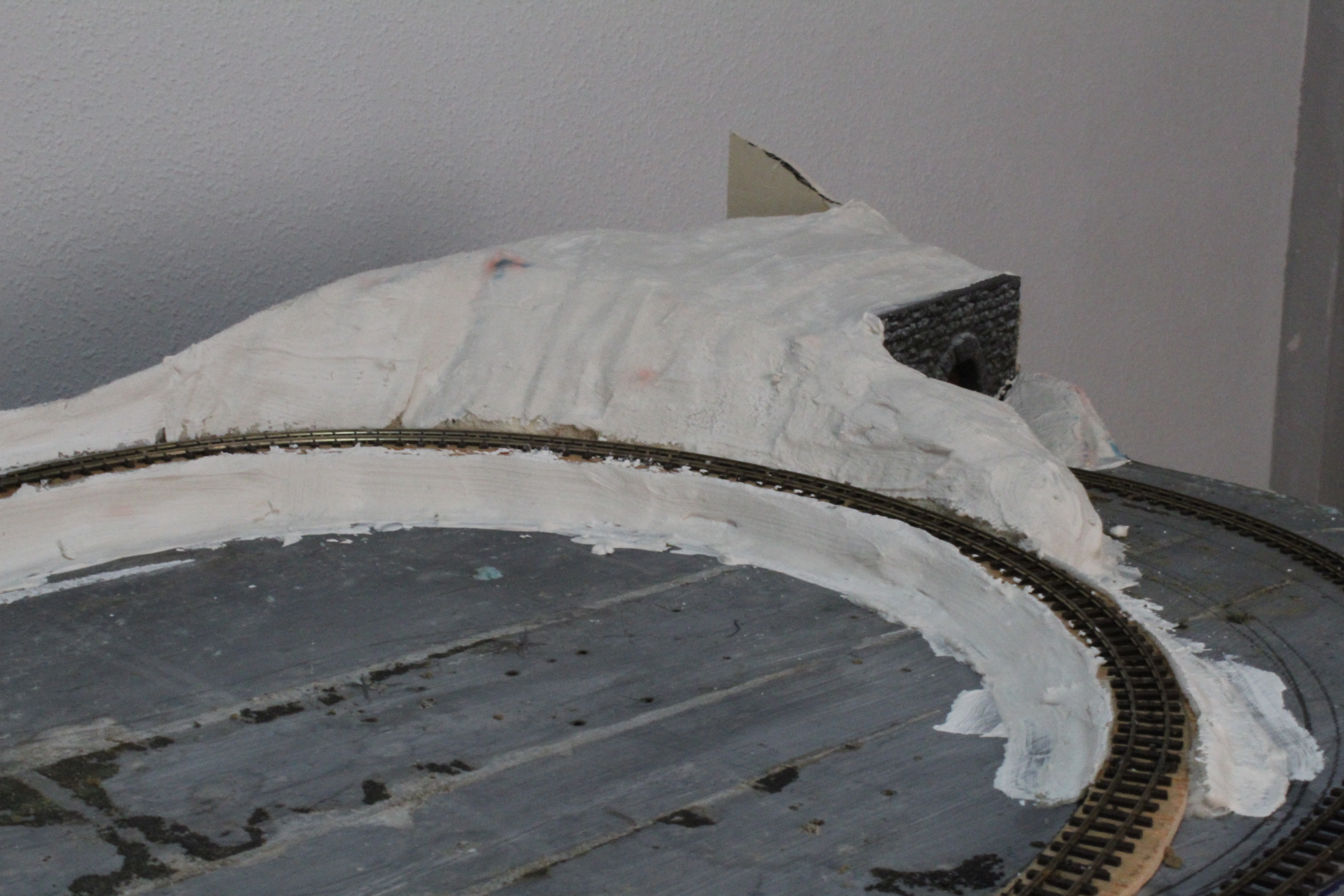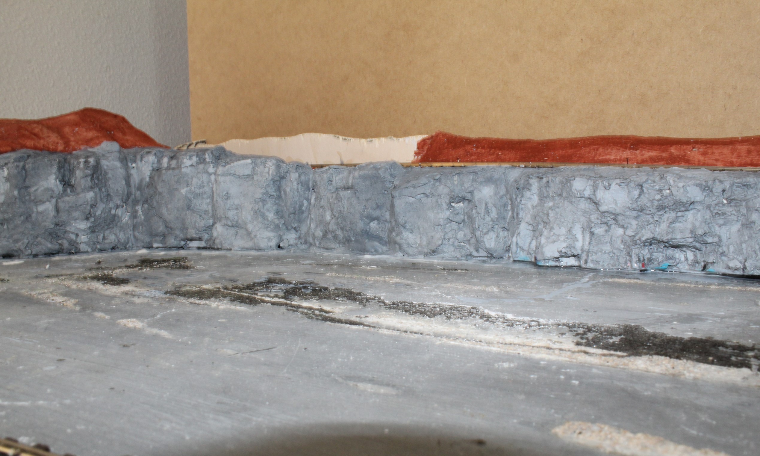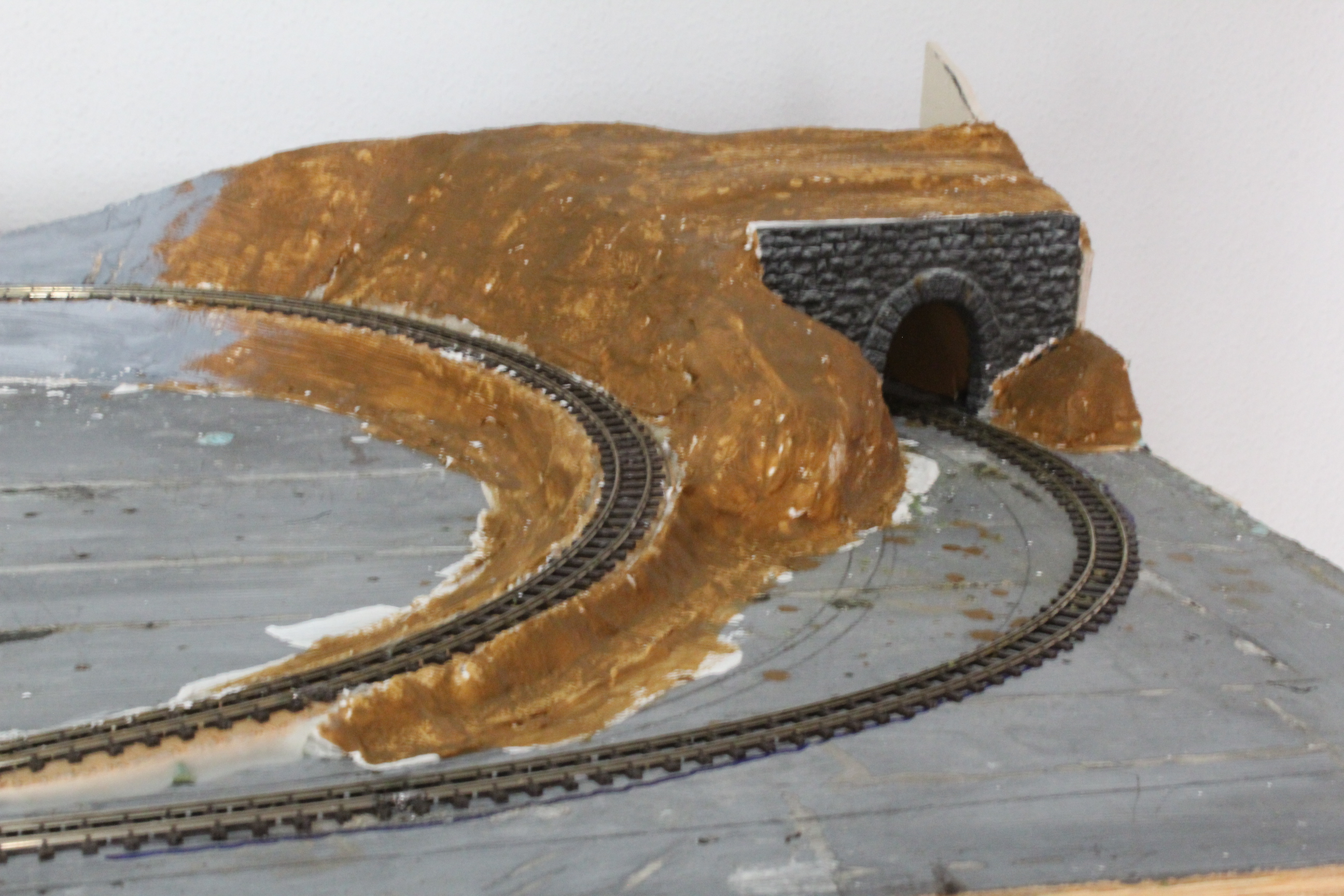 Then using bandages dipped in or painted with plaster of Paris we build up the hillside and then finally a coat of earth effect paint to form a base for the scatter materials to follow.