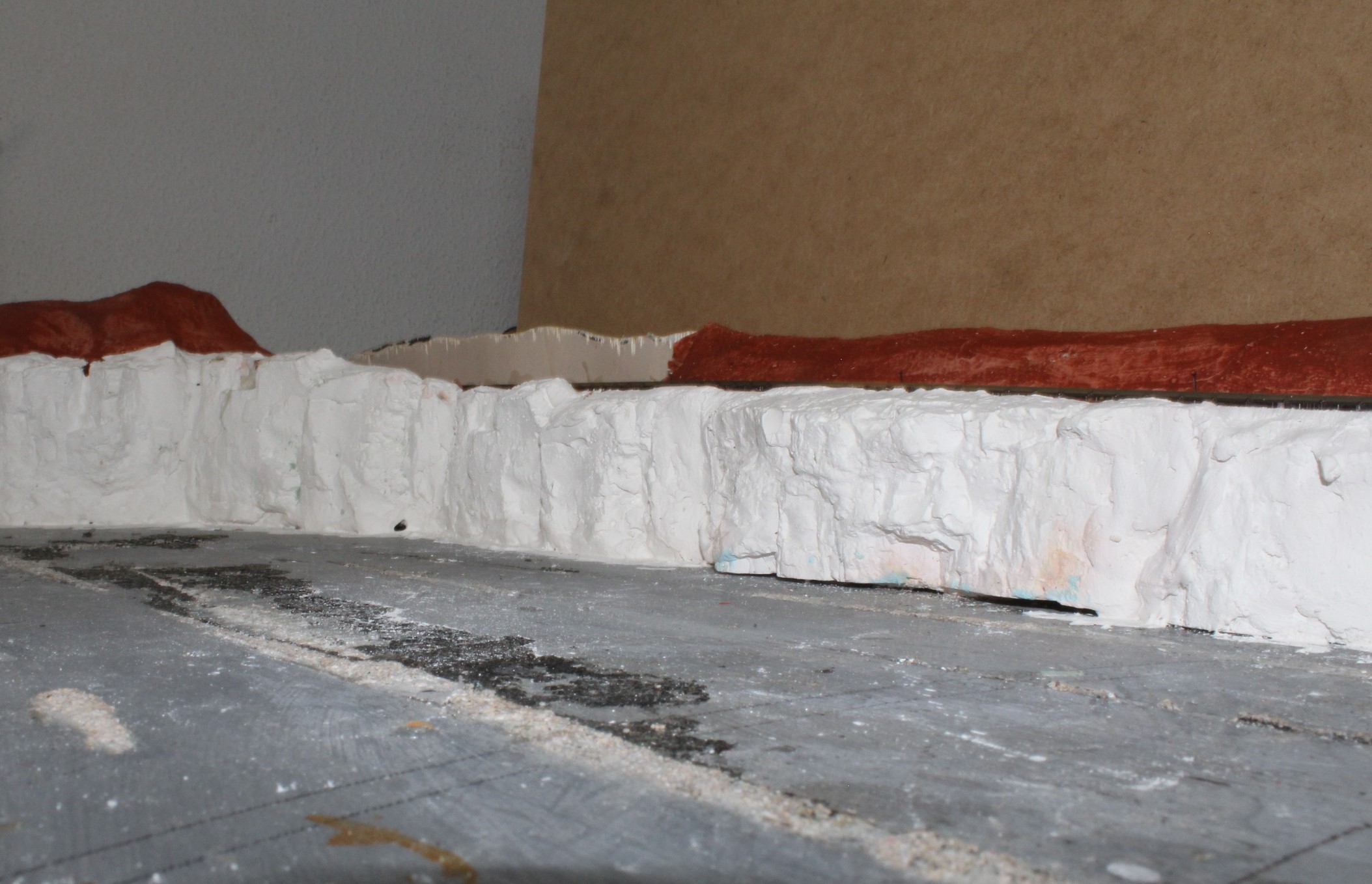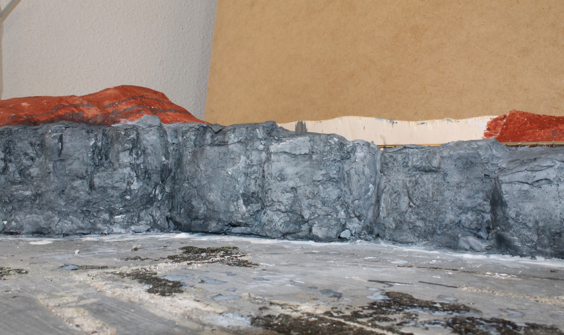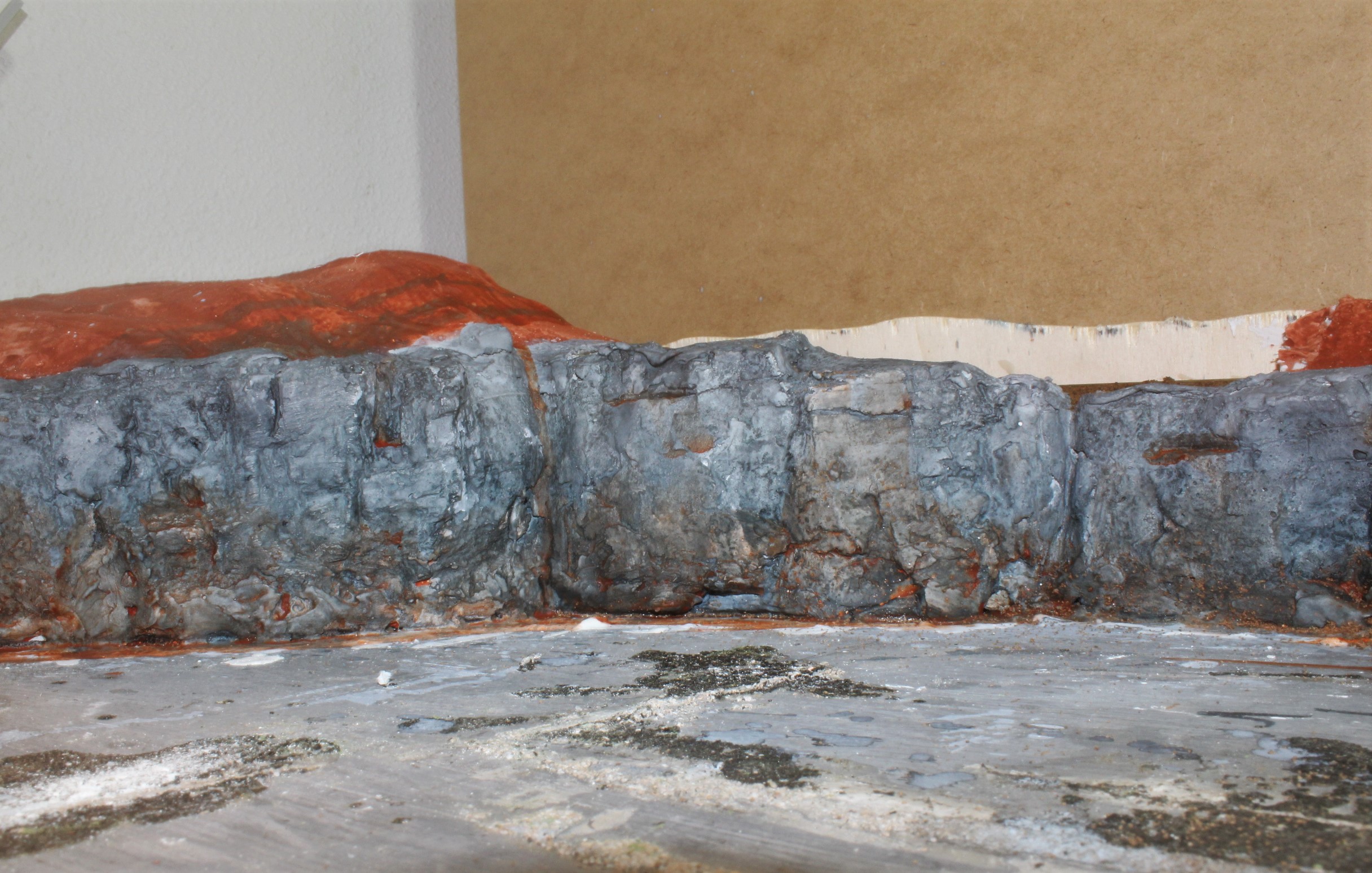 As a final touch I applied burnt umber onto any ledges where earth and vegetation might appear and also worked the paint up from the ground level, again to simulate soil and mineral contamination.