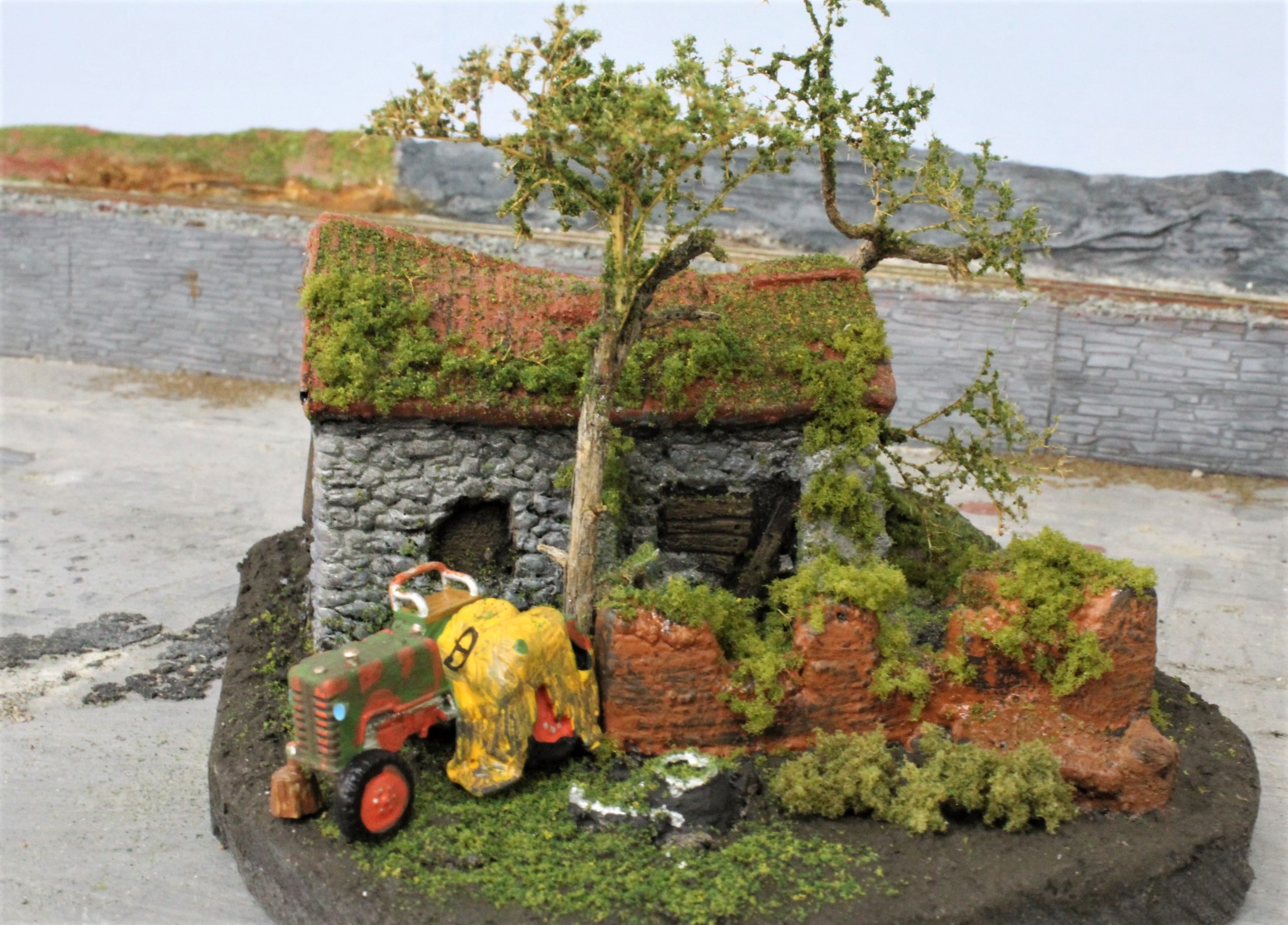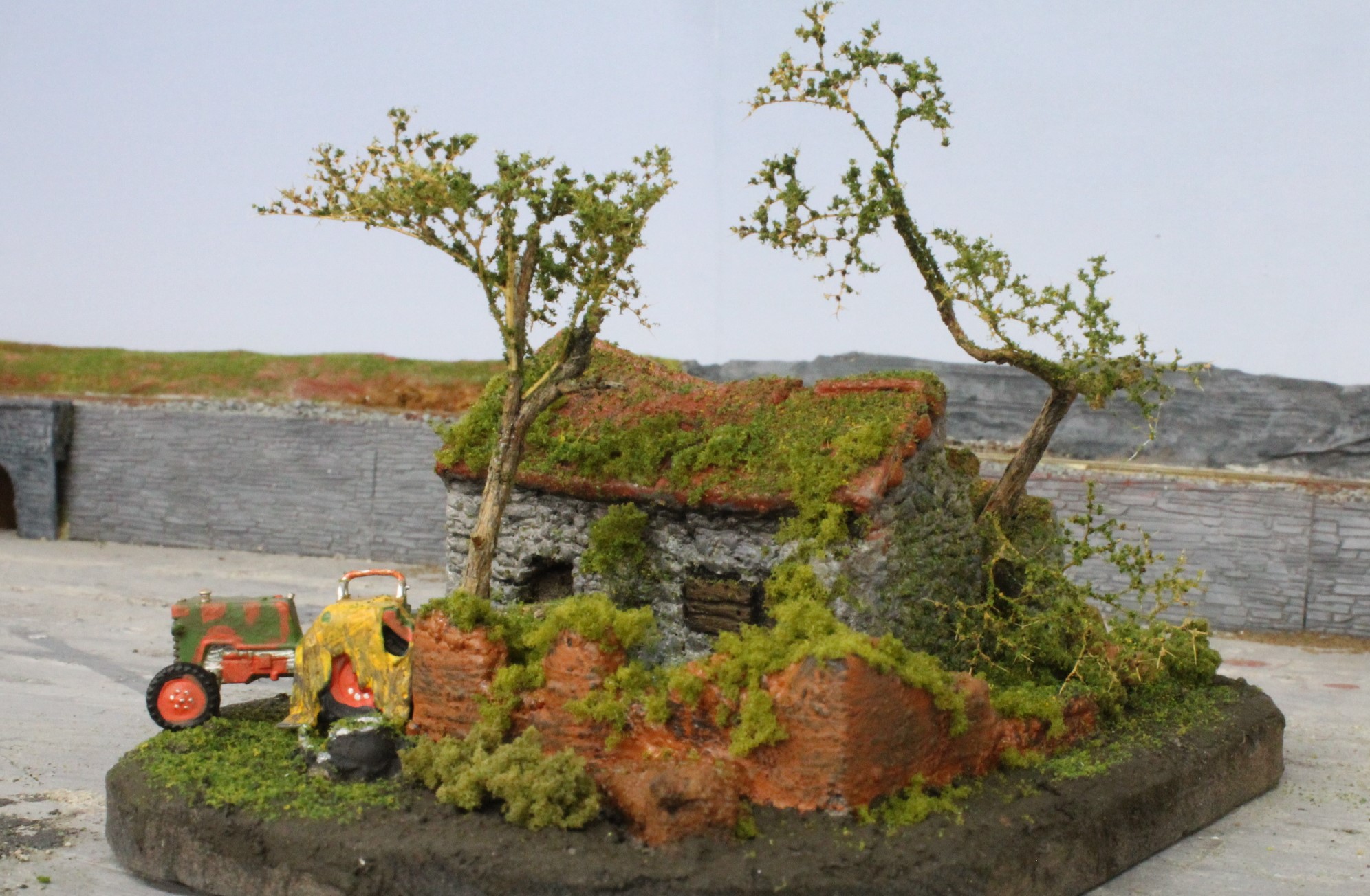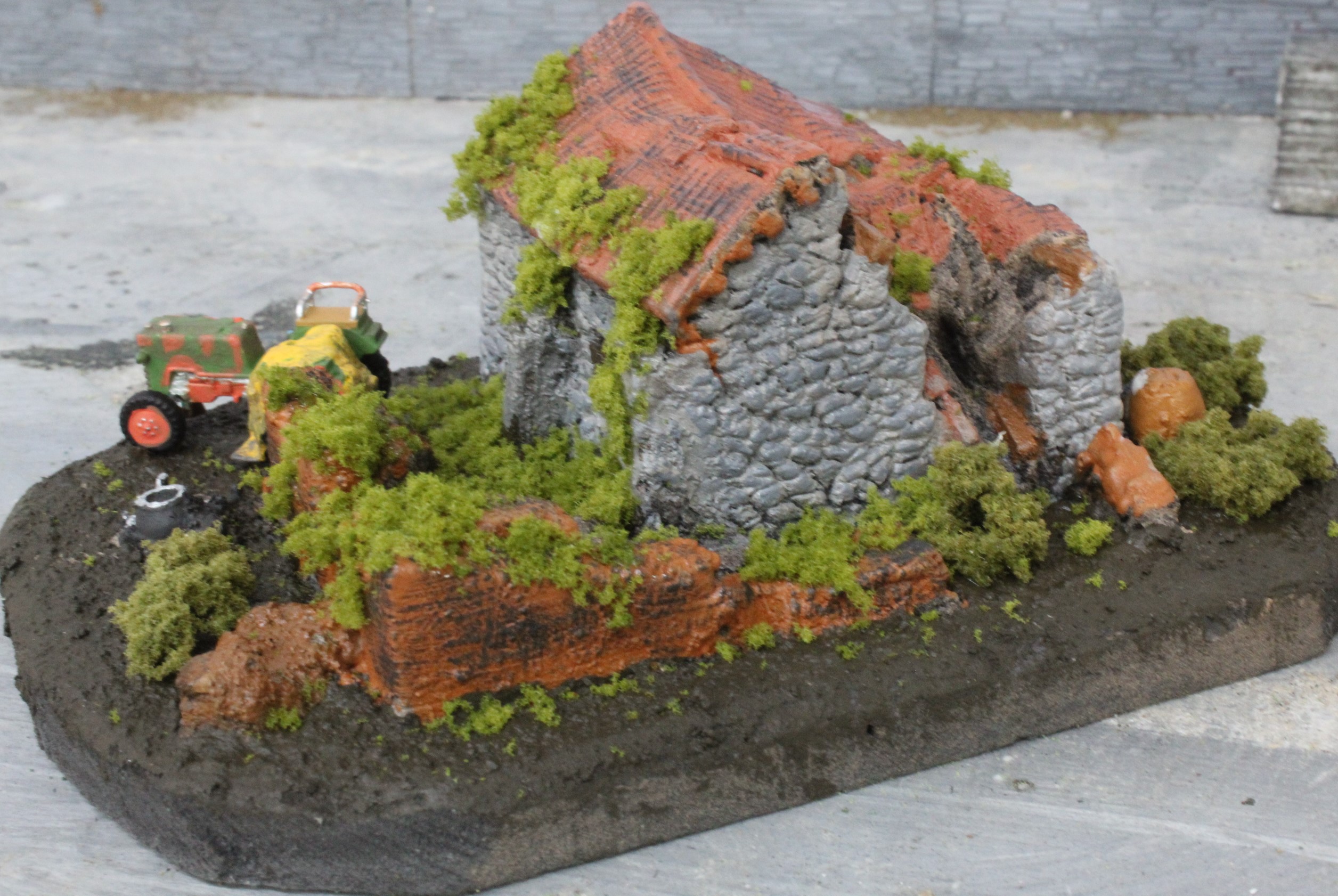 As a final touch I applied burnt umber onto any ledges where earth and vegetation might appear and also worked the paint up from the ground level, again to simulate soil and mineral contamination.