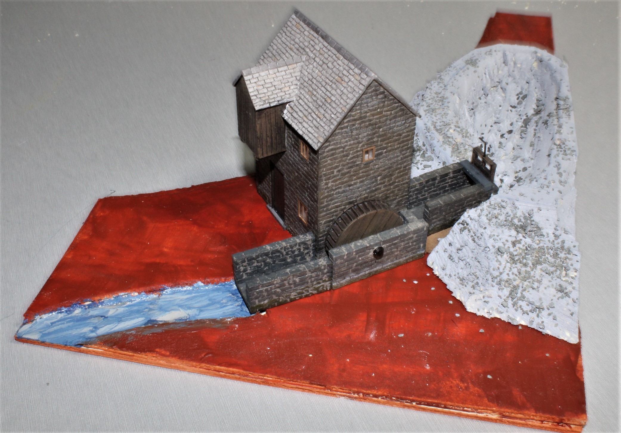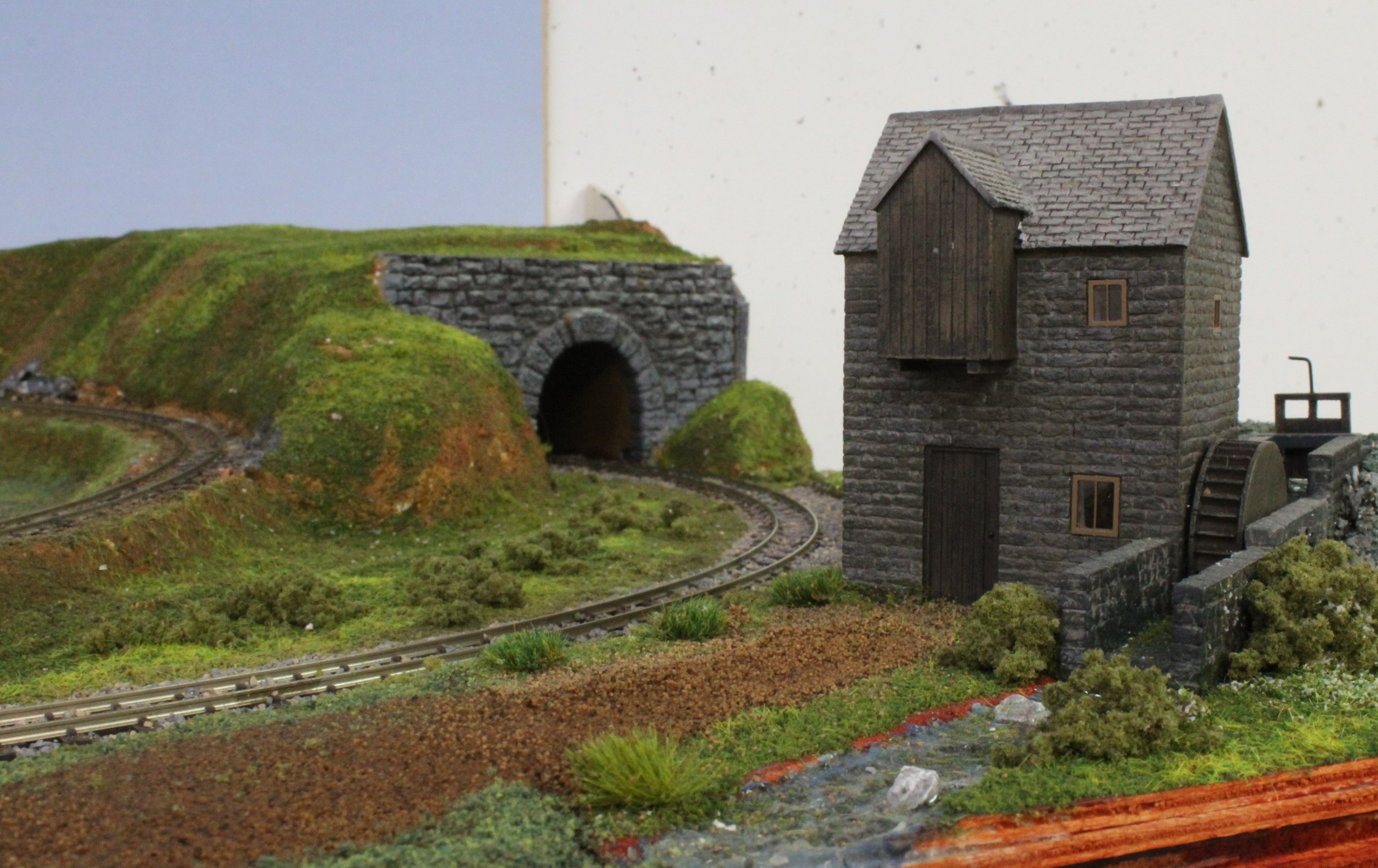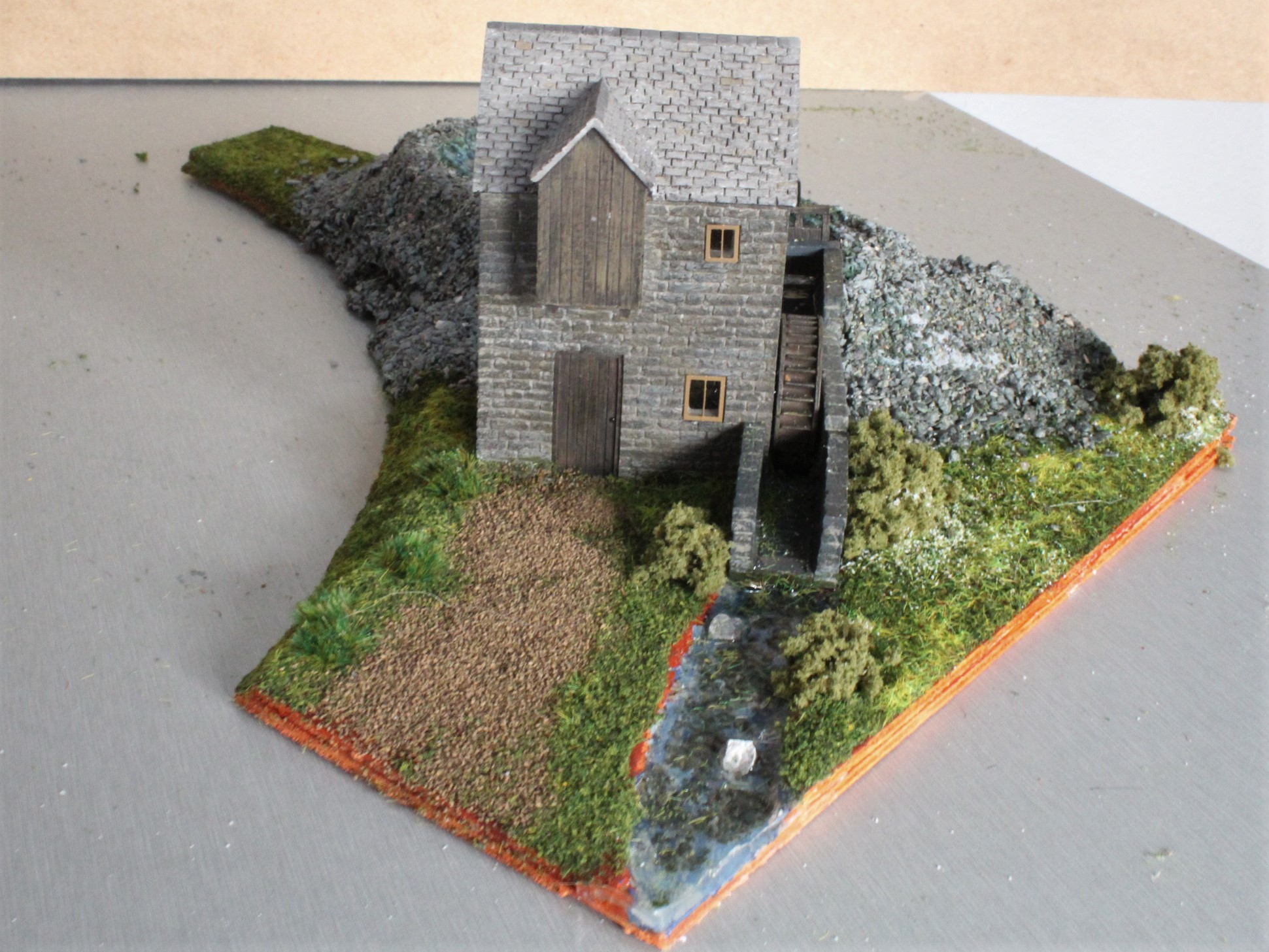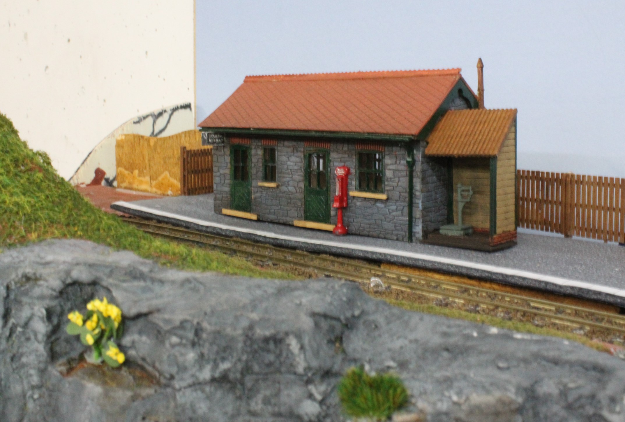 Once the layout was fitted and tested the first two buildings were put in place, these were the Water Mill feature that had been built previously and a little wayside halt station that at the moment is at the top of the incline that will eventually lead up to the Slate Quarry.