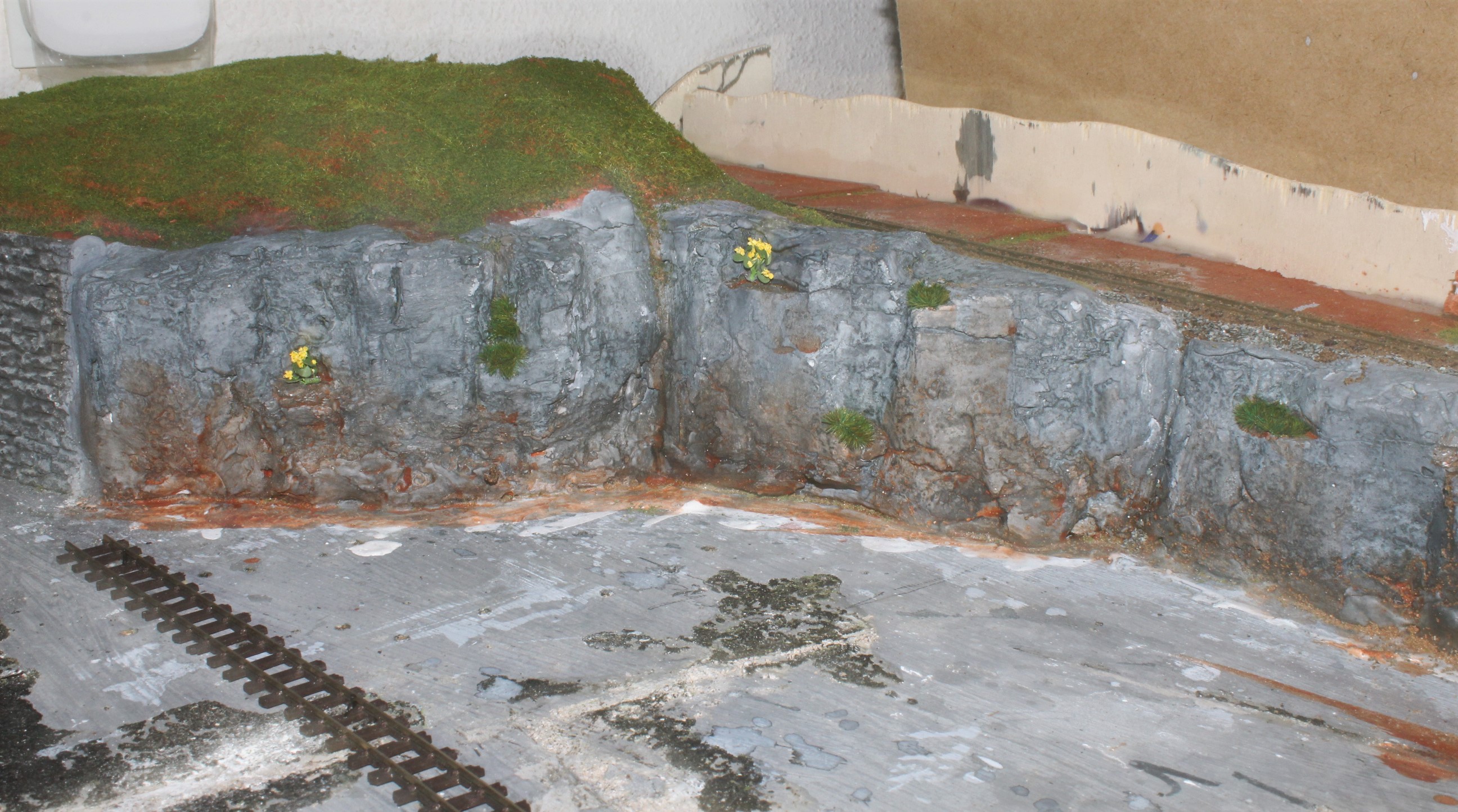 The type of filler I used when applied in large amounts as in this scenery does shrink as it dries and cracks appear after a few days. So I waited until it had stopped drying and then applied the second coating of scenery products. I didn’t use a static grass applicator this time because I wanted to create a sparse rock-strewn surface so the items used were grass flock, granite rubble and small bush foliage.