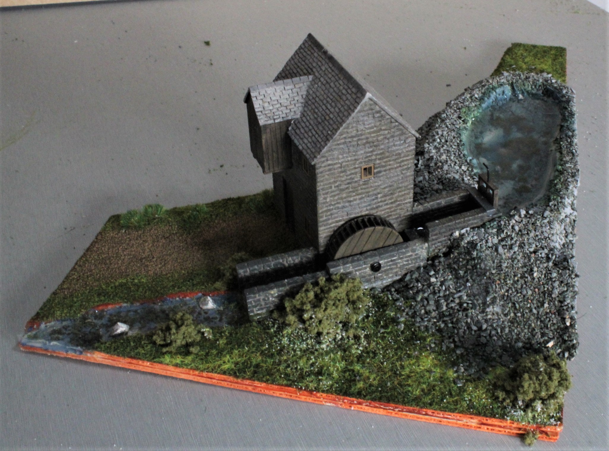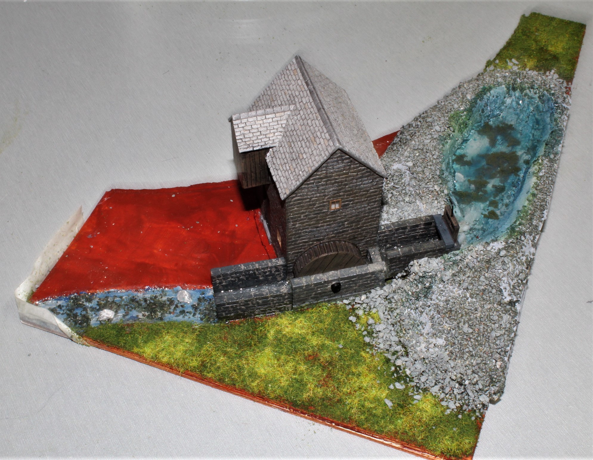 I recently purchased a Bachmann Water Mill which turned out to be quite a bit smaller than expected so it wouldn’t really fit where it was intended to, any way after a re-think I decided make a small cameo with it by sitting it on a small corner of the layout. I cut two pieces of 2mm ply to give the depth to make a small outlet stream. The catchment pond was carved out of a piece of fine grain packing material. This was all put together, painted and textured with a still water compound used for the pond and stream.