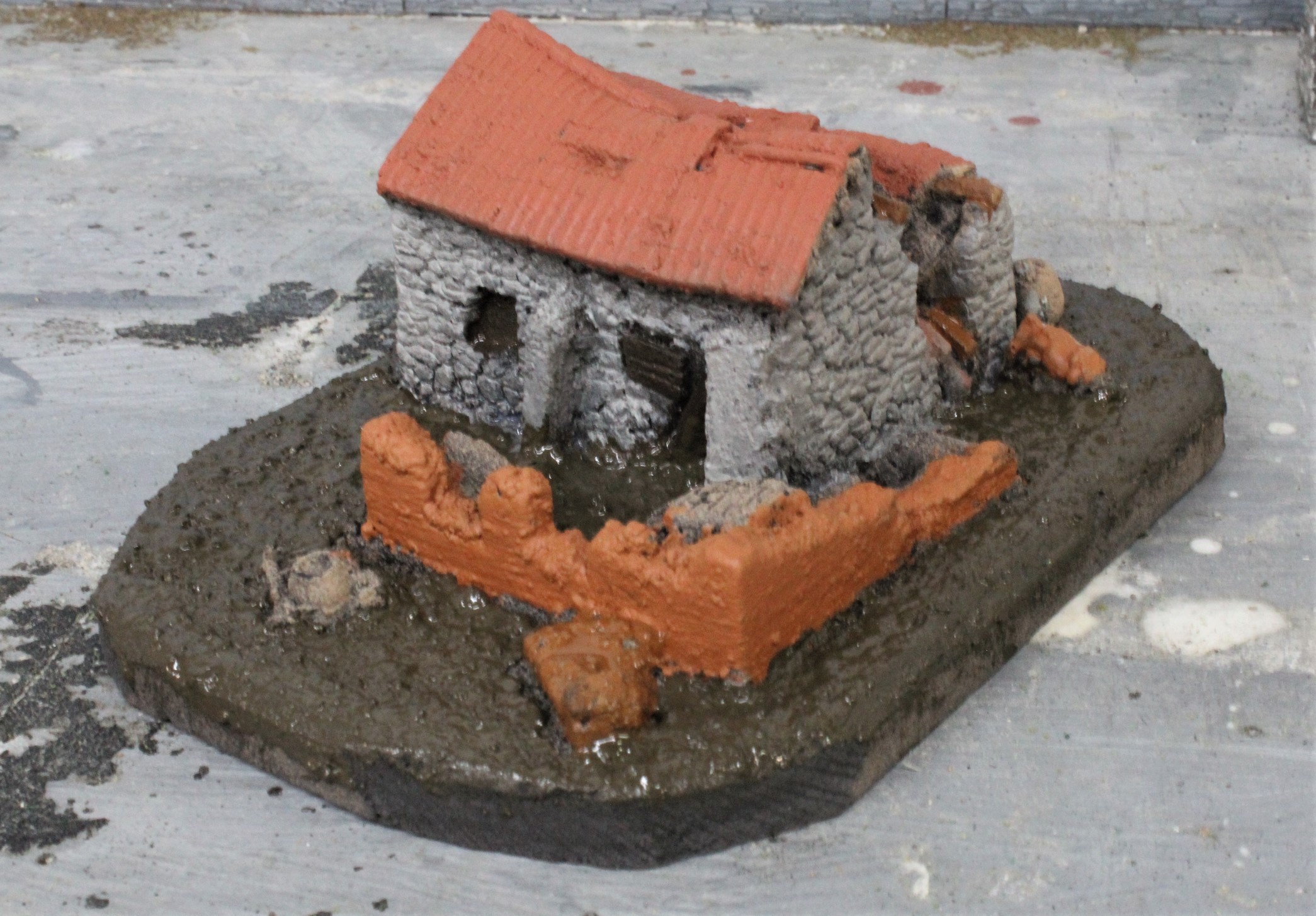 I rounded off the base moulding so that it would fit the intended site better and started painting using Lifecolors Rubble And Debris paints and the ground was coloured with AKs muddy ground from their war-gaming range.