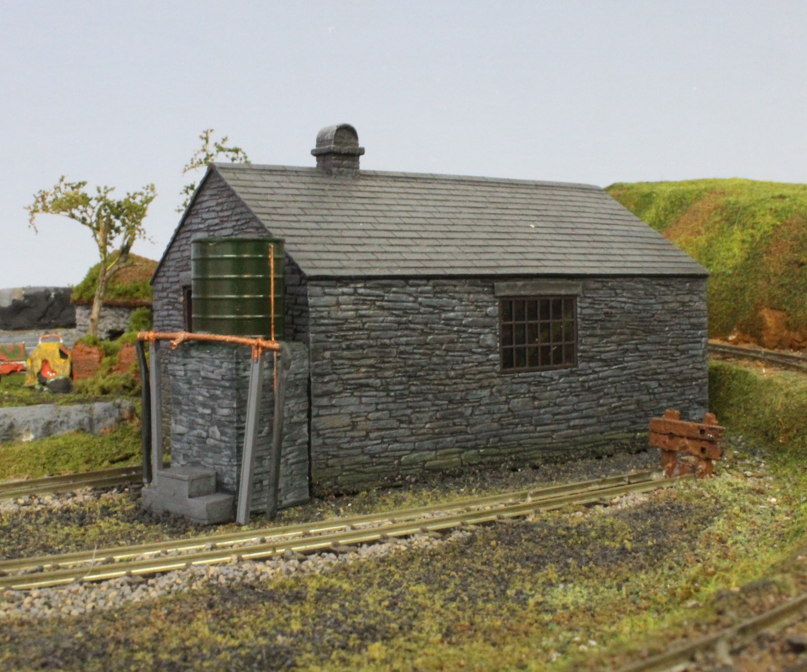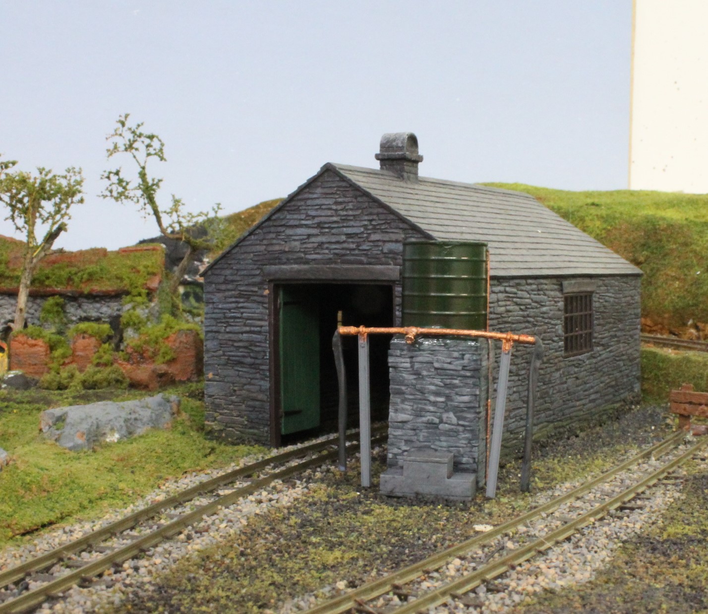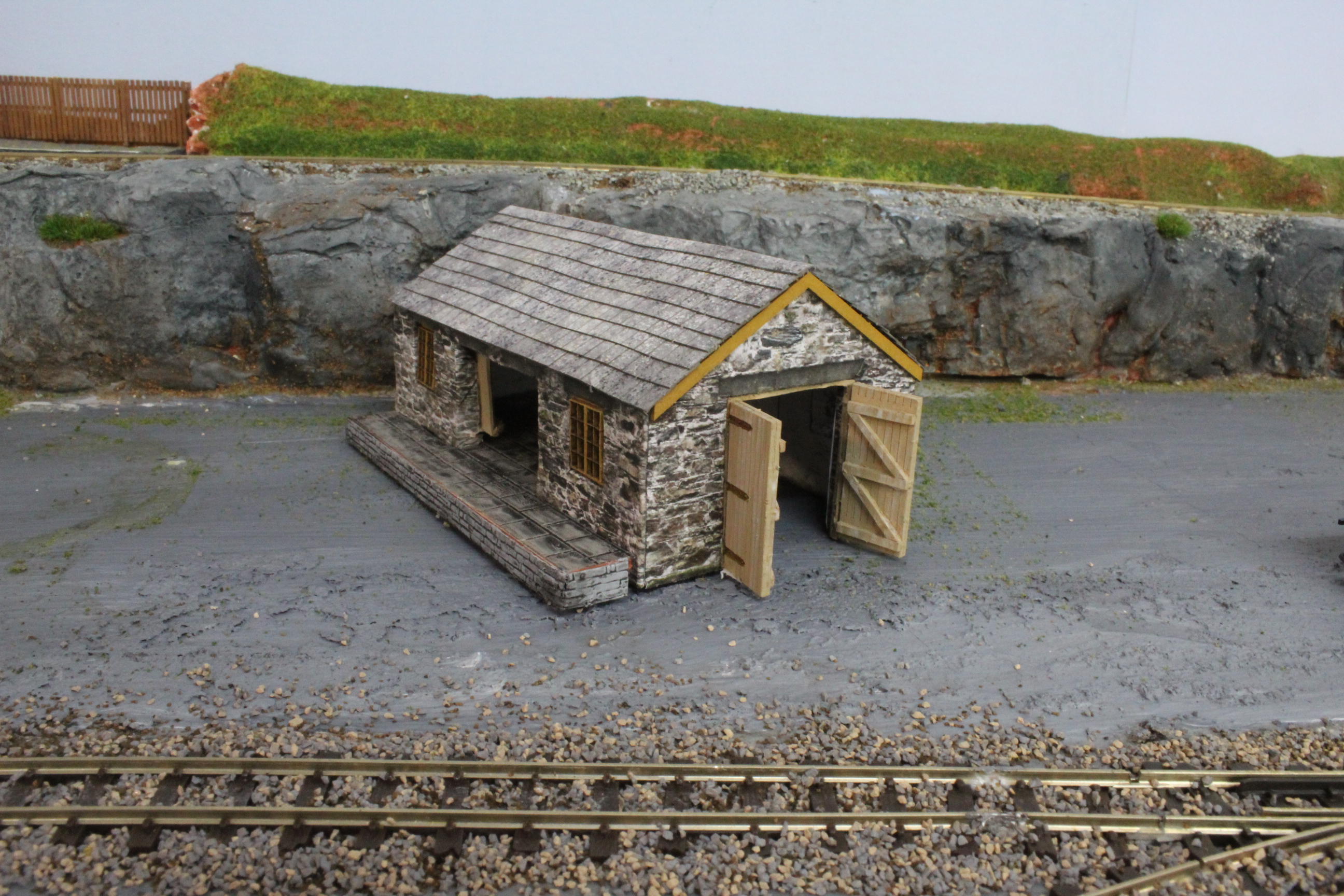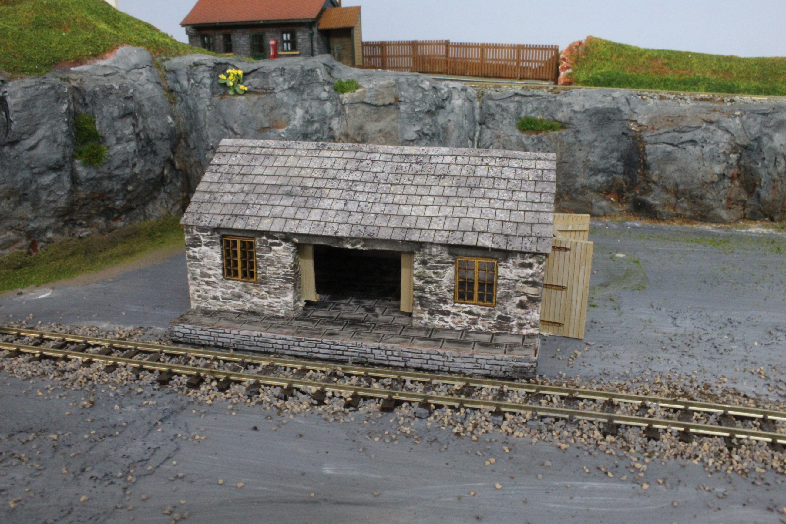 The goods shed was made from a lasercut workshop kit modified and detailed and with the addition of a loading platform.
