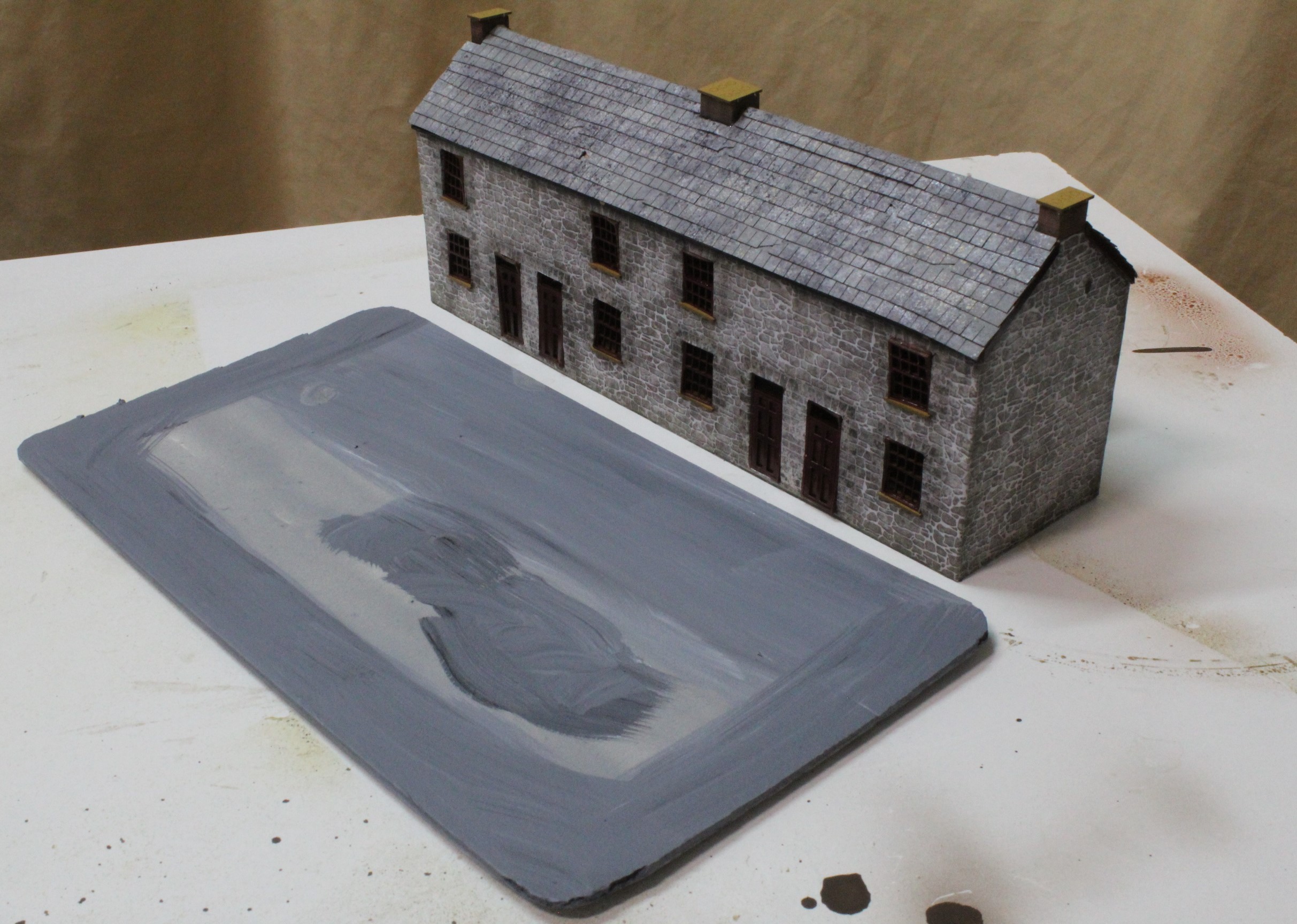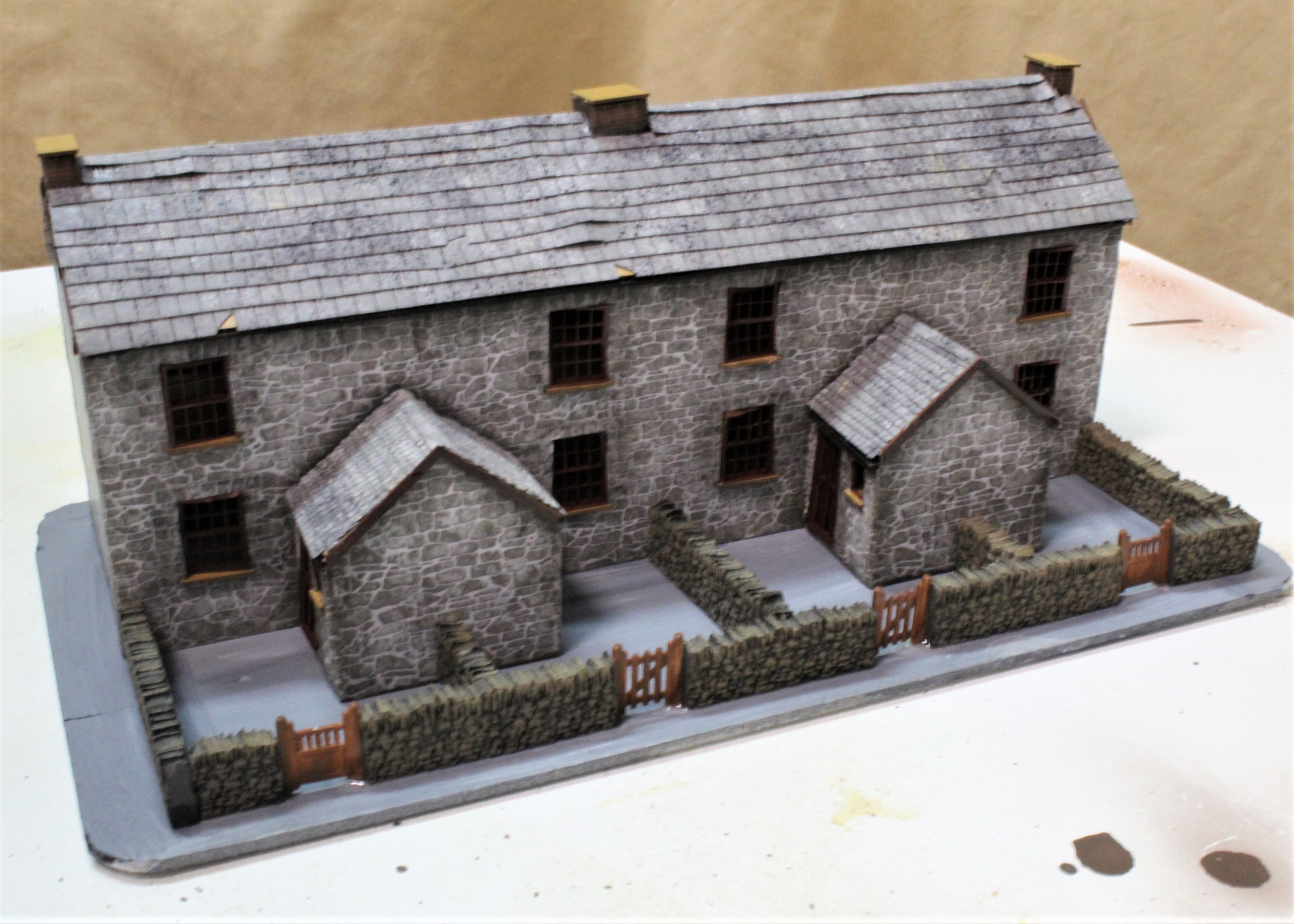 The biggest building in the main street is the row of cottages made from a laser cut kit. I prefer all buildings to be modular at the moment so that it is easier to remove them for detailing so a base was made from foam sheet to fit it on then I added the back yards.
