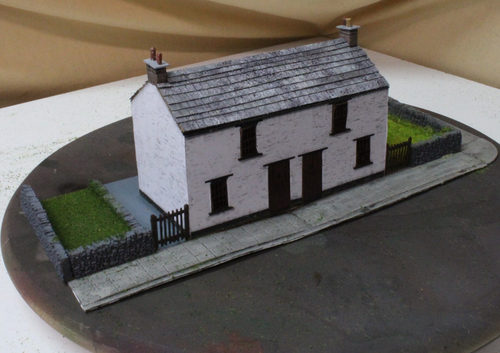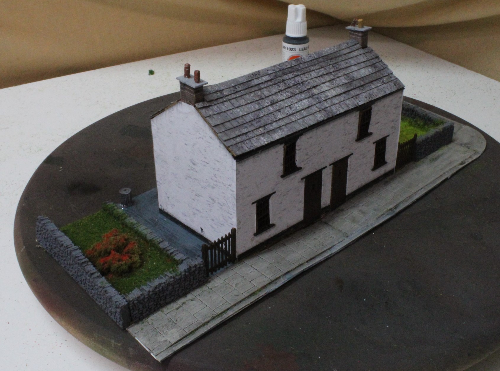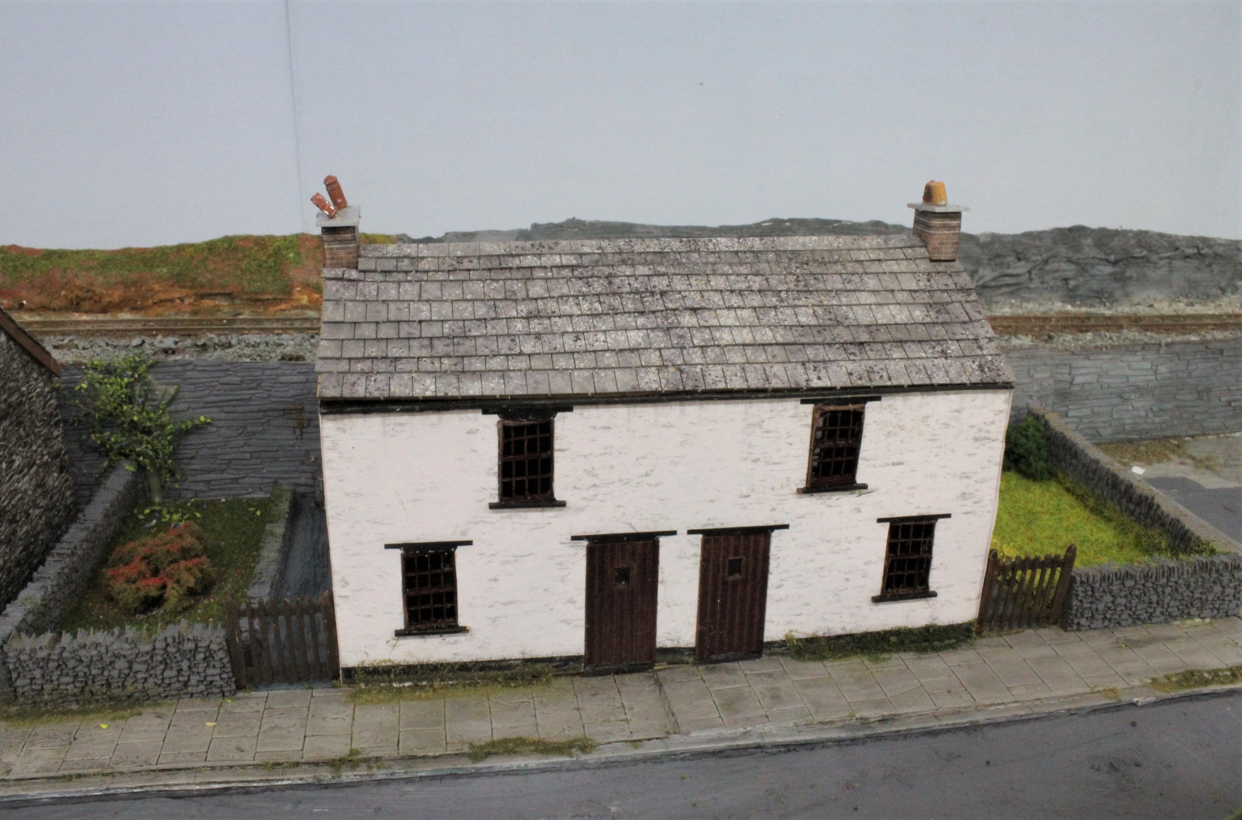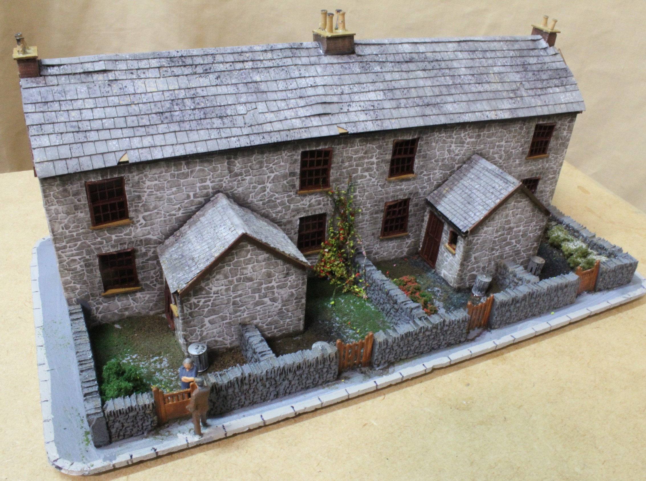 The cottages were built in the same way. a lasercut kit placed on a prepared base and then extra features added, lawns, flowers, dustbins etc. All the walls, pavements and pathways were textured and weathered before fitting the cottage.