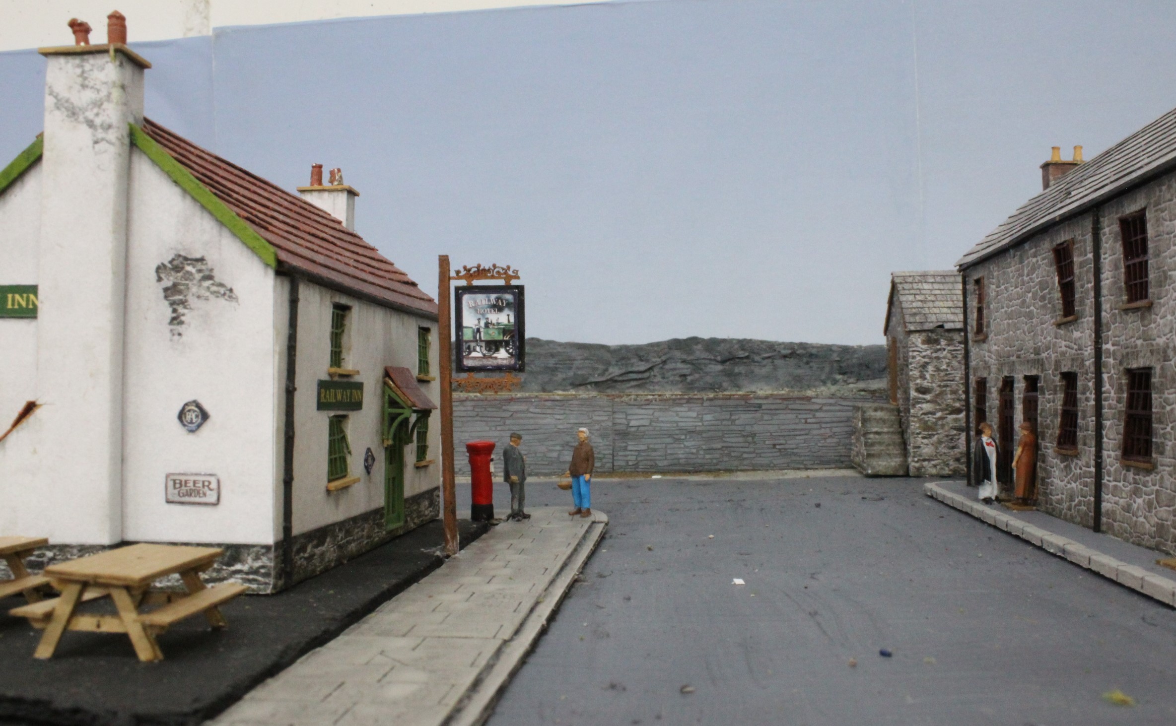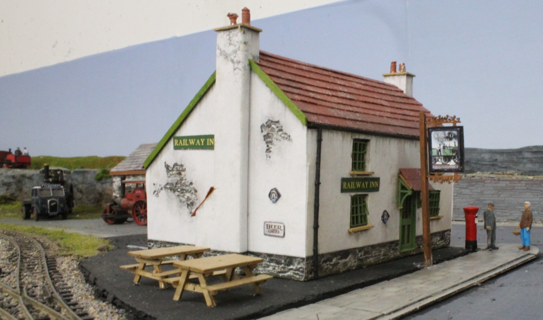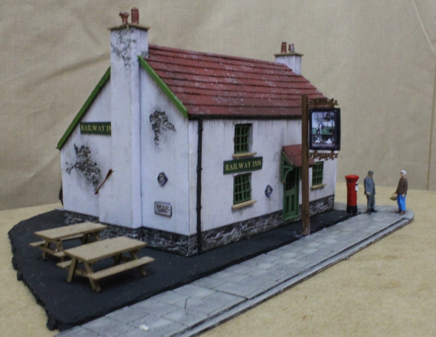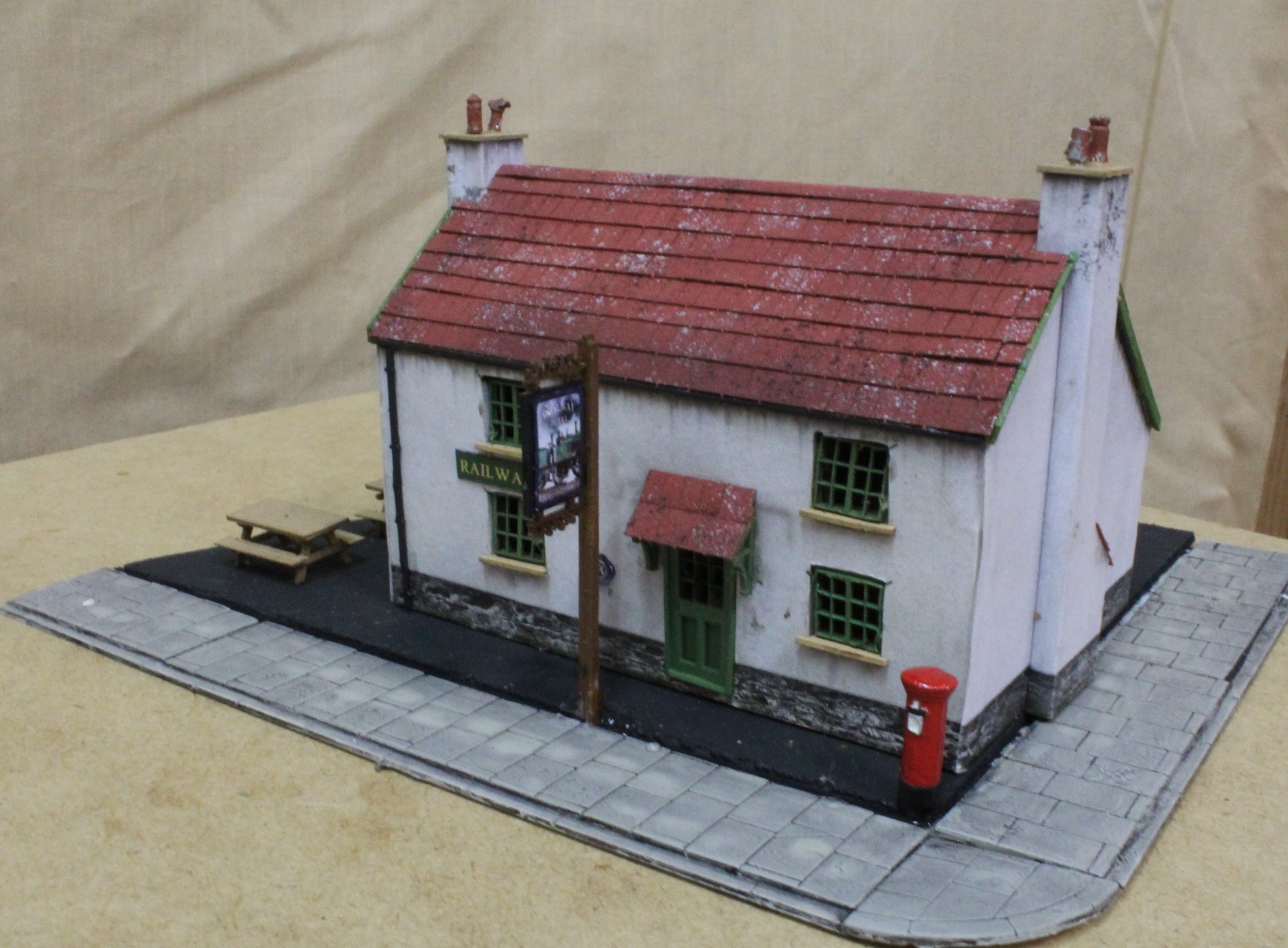 This was made from a lasercut cottage with signage and then extra details added before securing the module to the main board. It just needs a few revellers adding now to complete the scene.