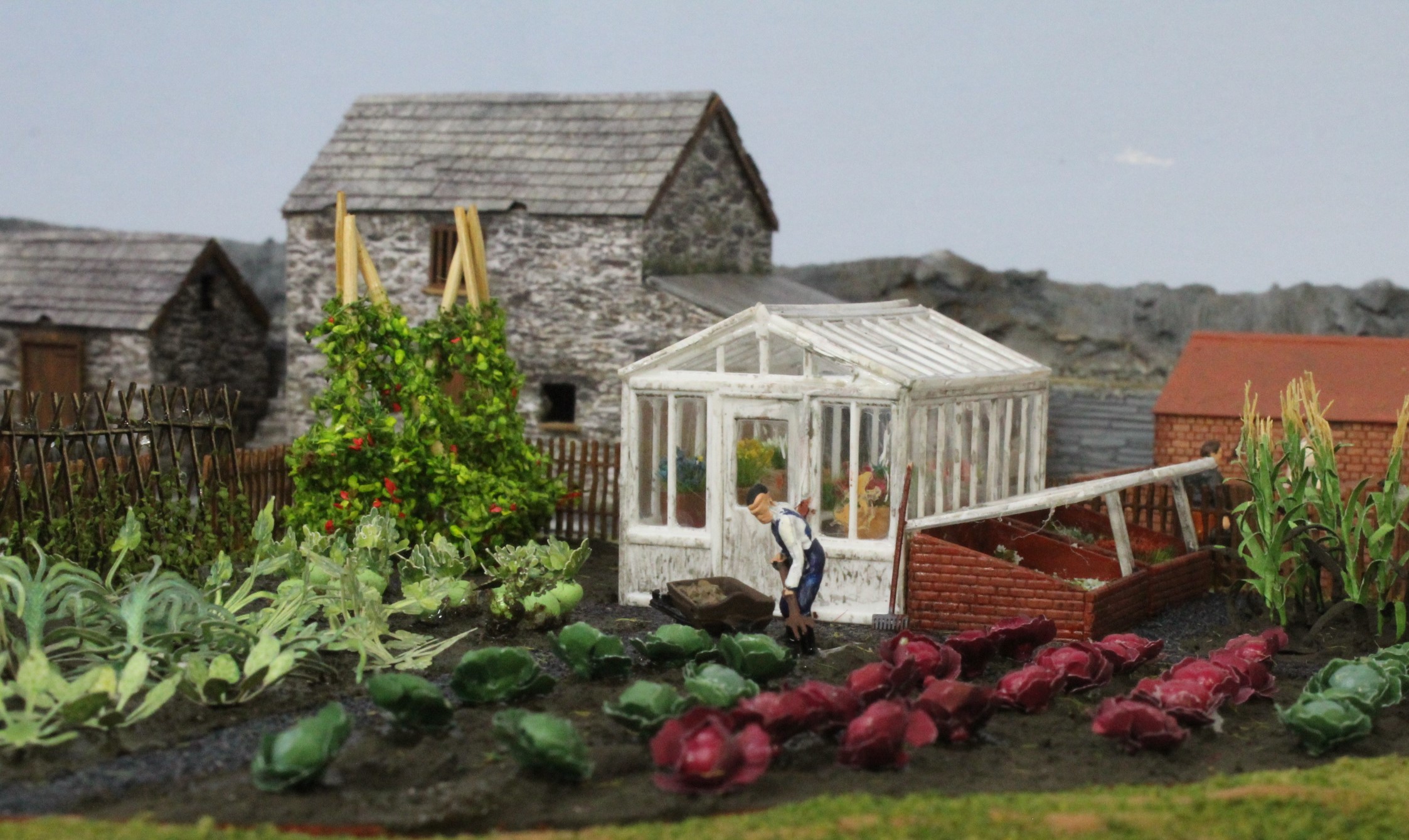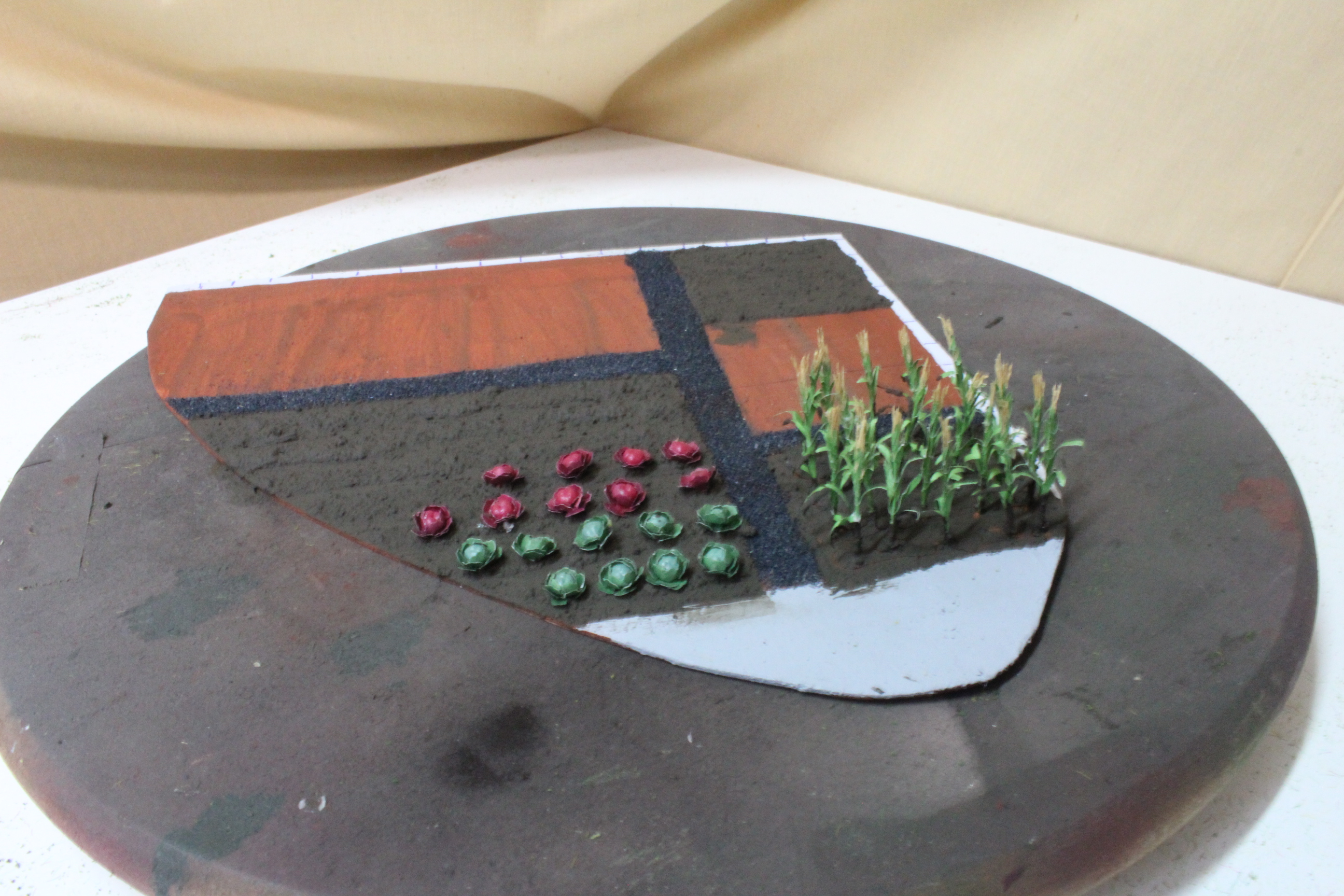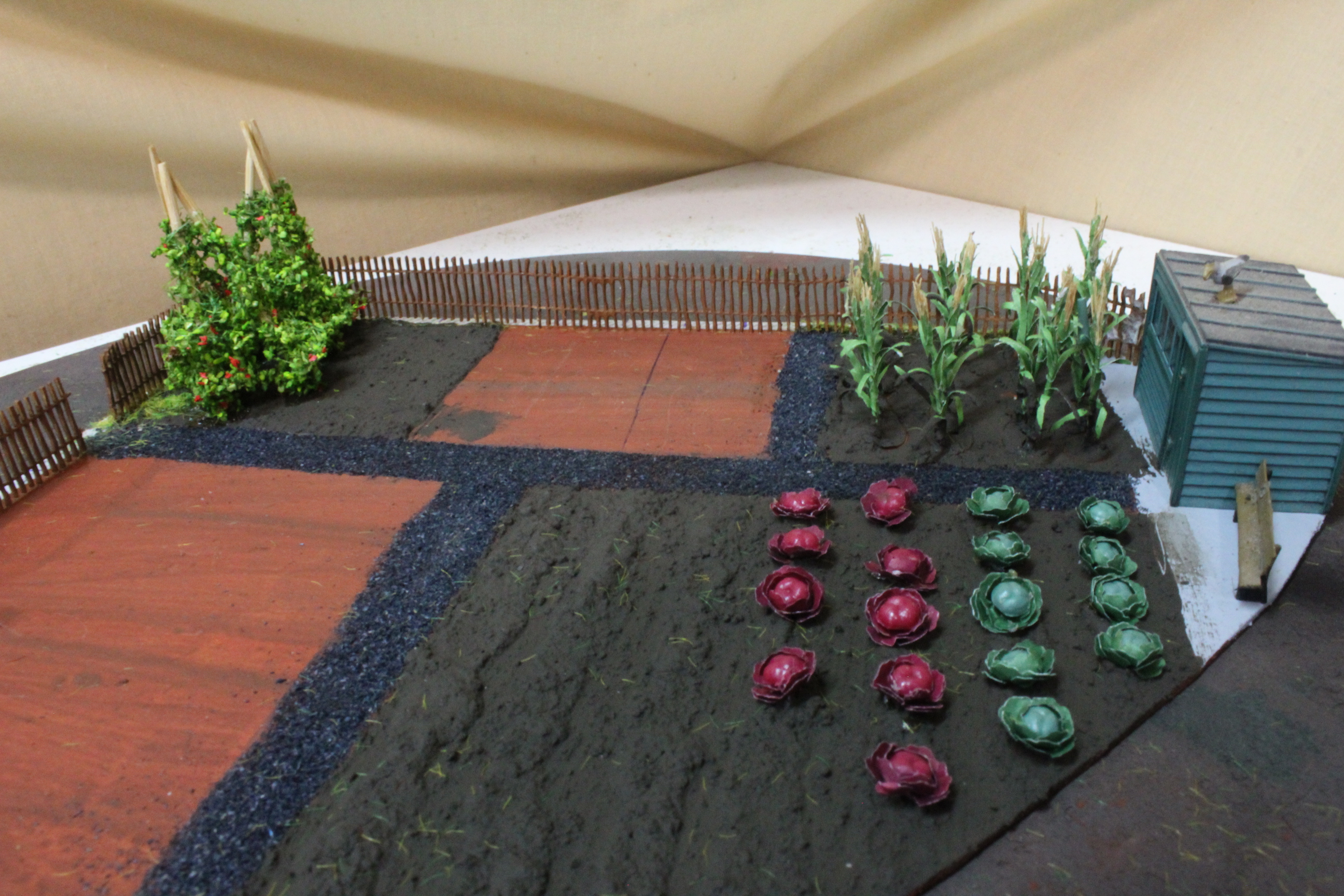 A start was made by cutting out a suitable shape and then marking out cinder paths and vegetable beds, each bed was then filled with an appropriate selection crops mainly from the Tasma range plus some Noch Laser Cut products.