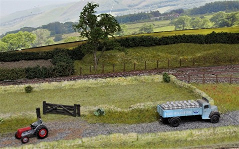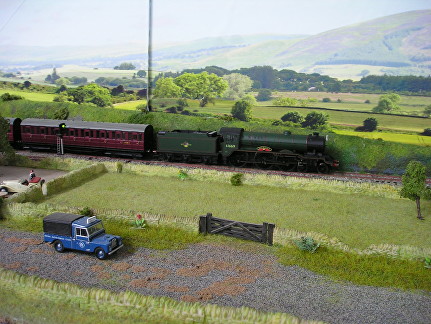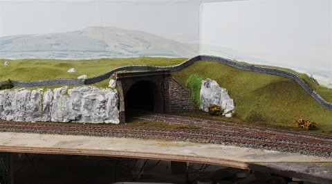 This was made by re-using an old tunnel mouth which was repainted and weathered, the shape of the hills was built up using sterene and foam off-cuts which were covered in layers of bandages soaked in plaster. The structure was painted a base colour of dark brown which was then covered in a static grass mixture to create a more natural effect.