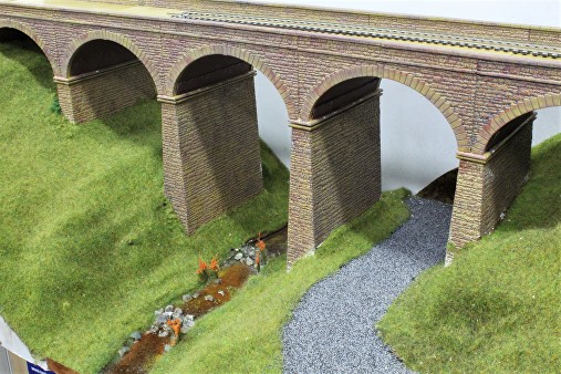 The pillars and arches of the viaduct were spray painted a light sand colour then dry brushed over with three increasingly darker brown shades and a final wash of a watery black mix.
