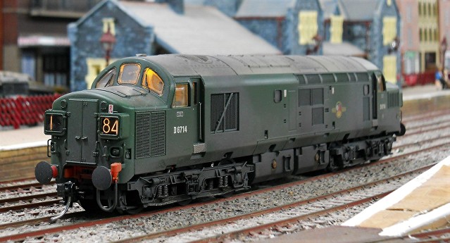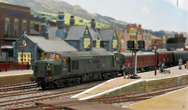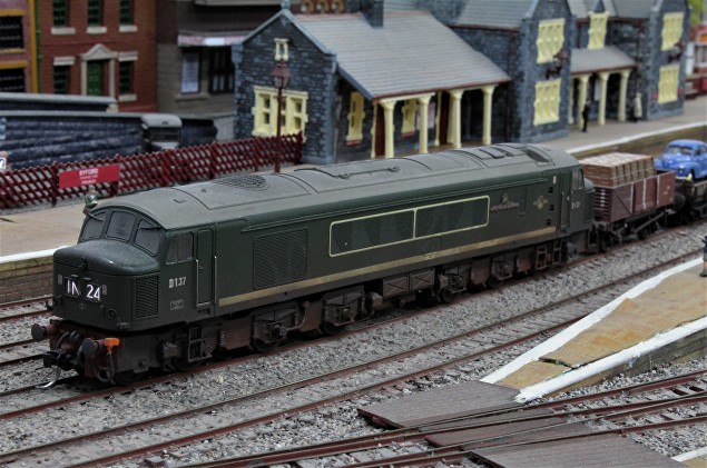 D137 The Cheshire Regiment threads its way into town. clears the station then heads away with loaded carflats to boost the export trade.