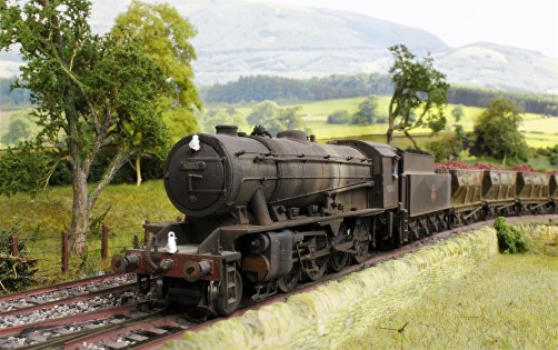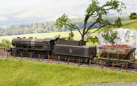 WD 2-8-0 waits at the station for a clear road. Then departs crossing Felldale Viaduct.