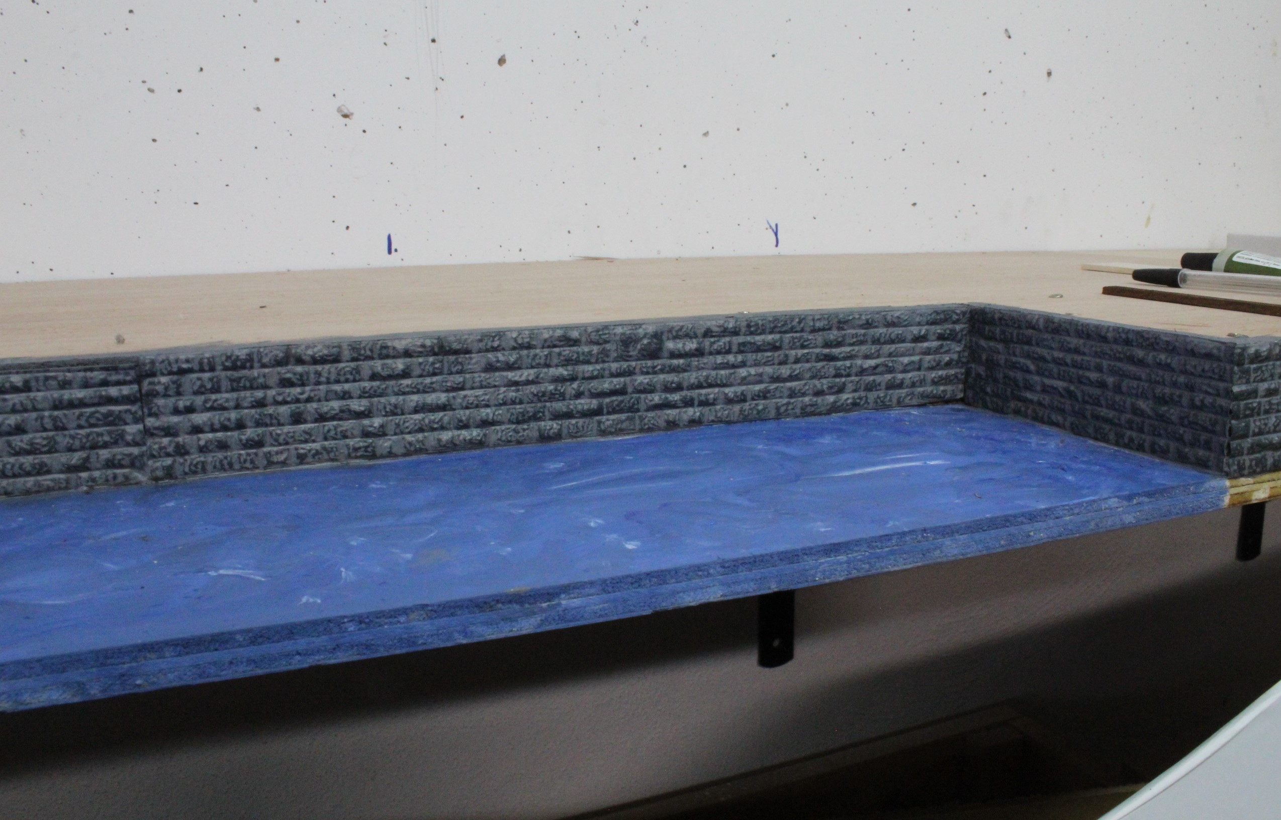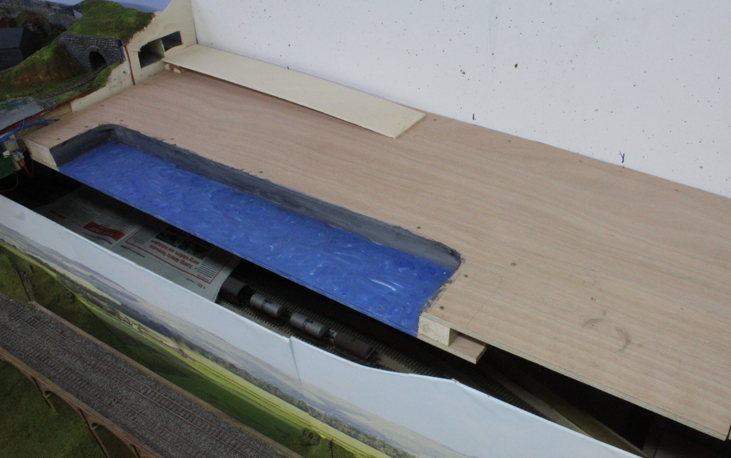 The first stage was to seal all the joints to make it watertight ( a small lip needs to be added along the front) and then rough coating of paint so that no bare wood is showing and artificial water and colouring can be added later.