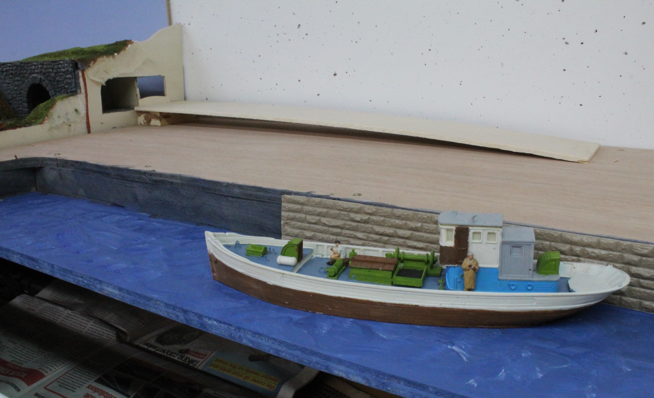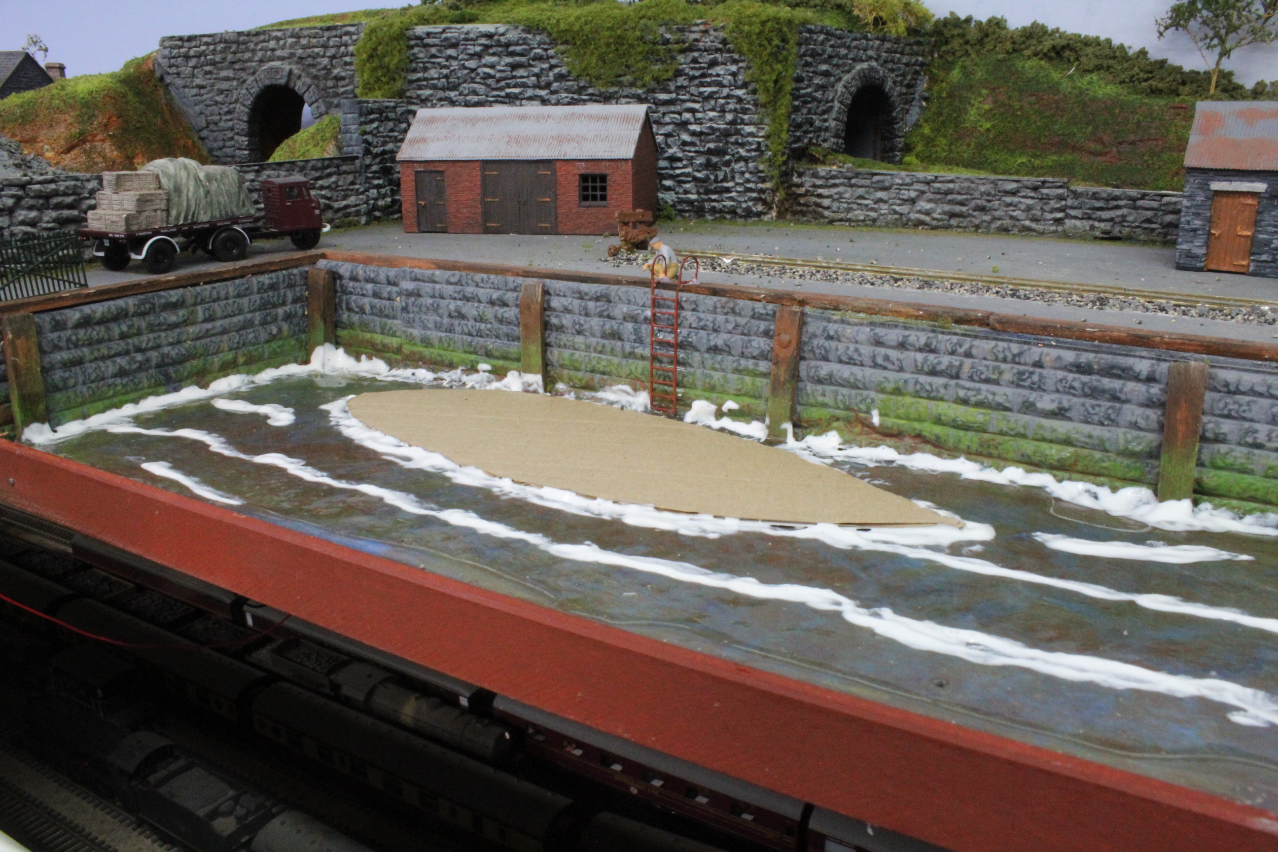 Using AK products I first filled the Dock area with Resin Water and once it had dried the boat was positioned and bearing in mind I have to reach over it to access the layout it was placed at one end and then a cardboard former was used to build up the water ripples around the outline so that it would not be fixed in place but would move if knocked.