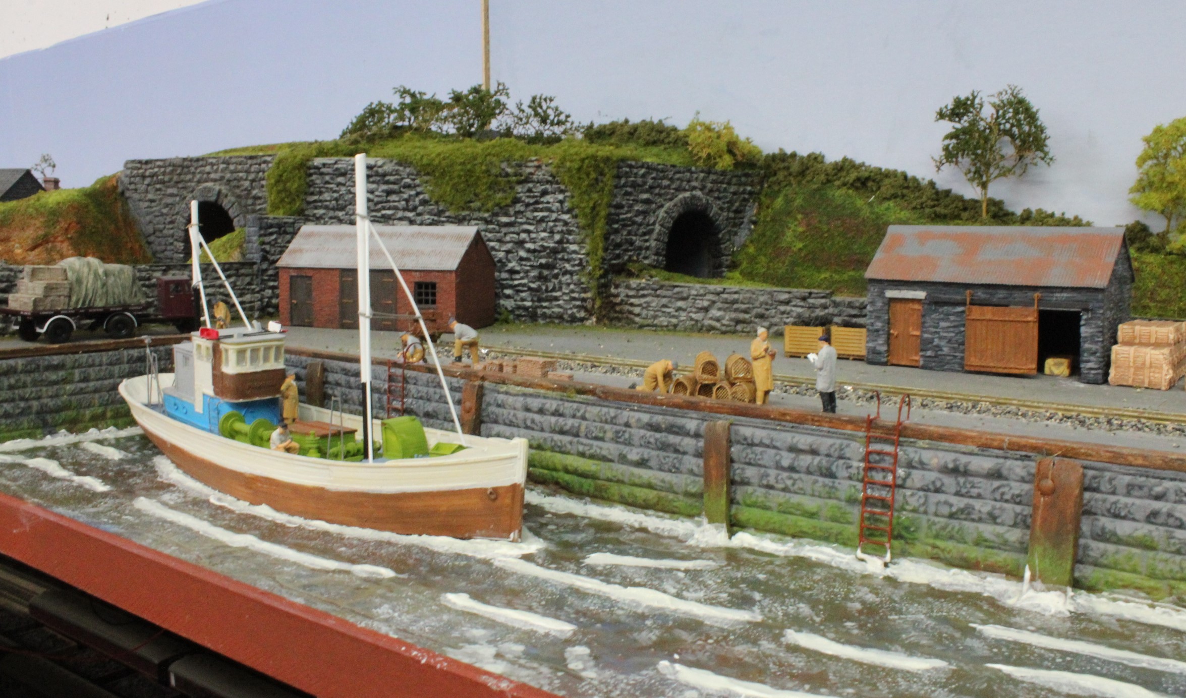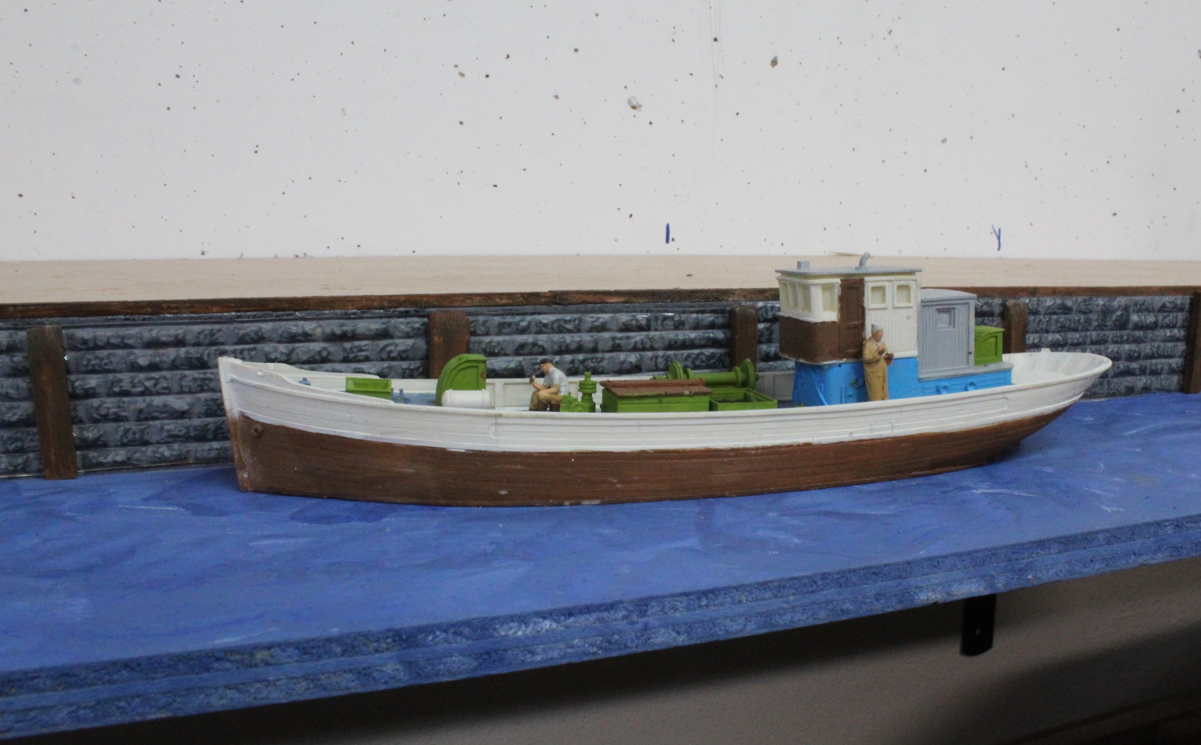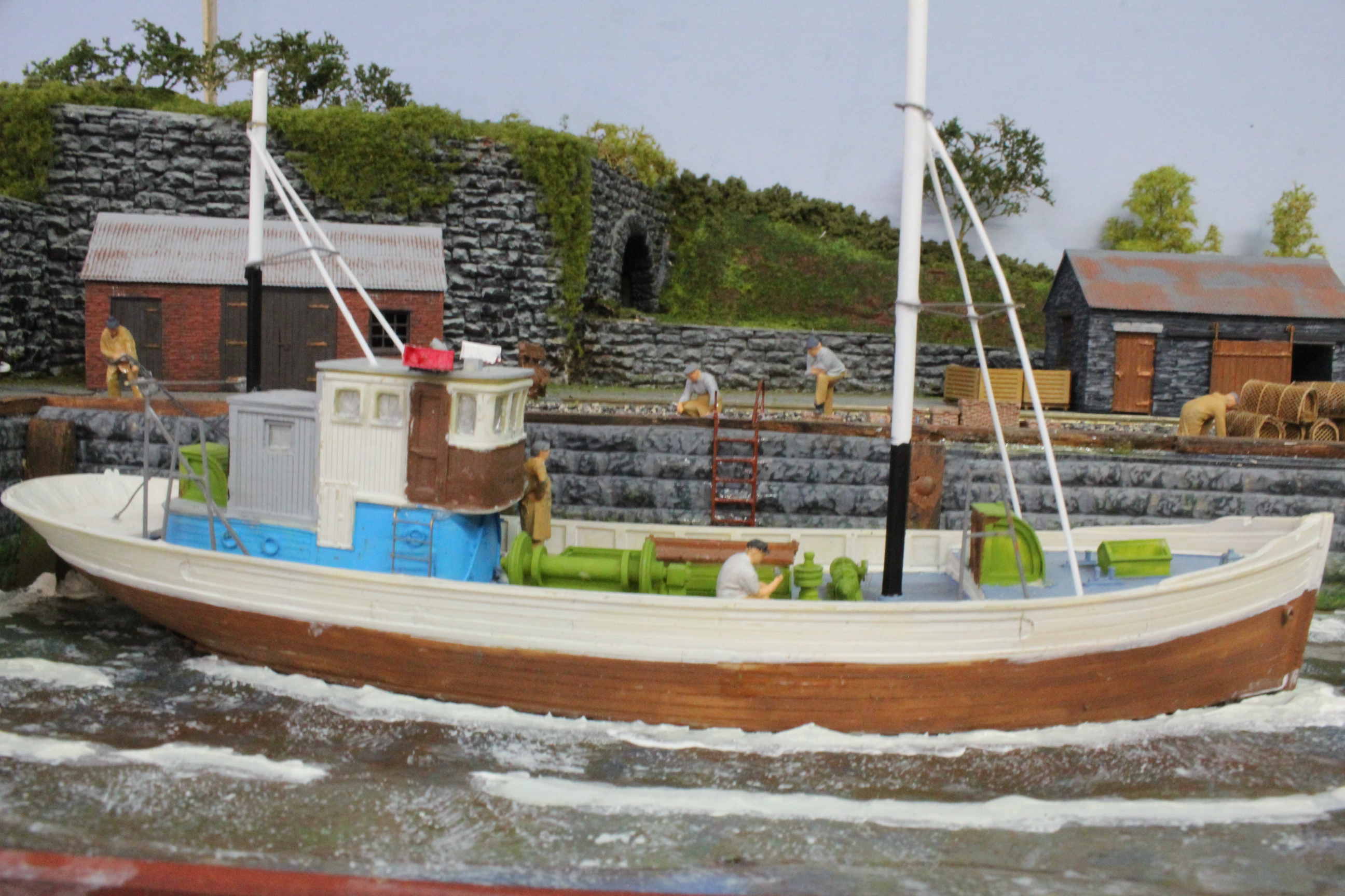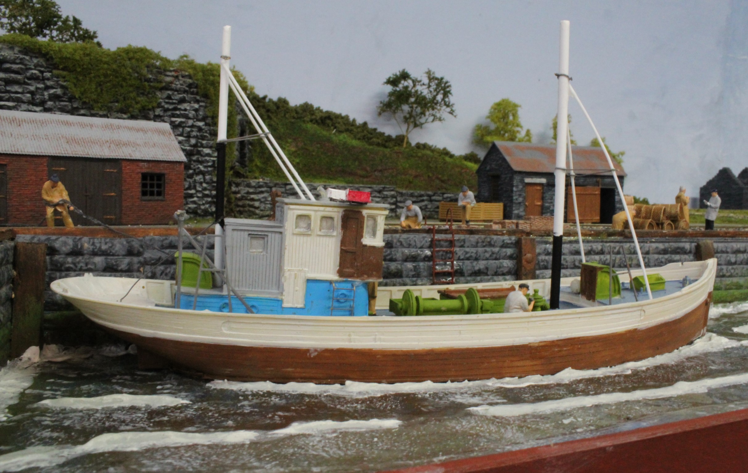 And, finally some Modelu Fishermen were placed on the scene although there is still work to do the boat needs finishing off (easy to do now that I can just lift it out) and there are some more fencing and bollards to fit