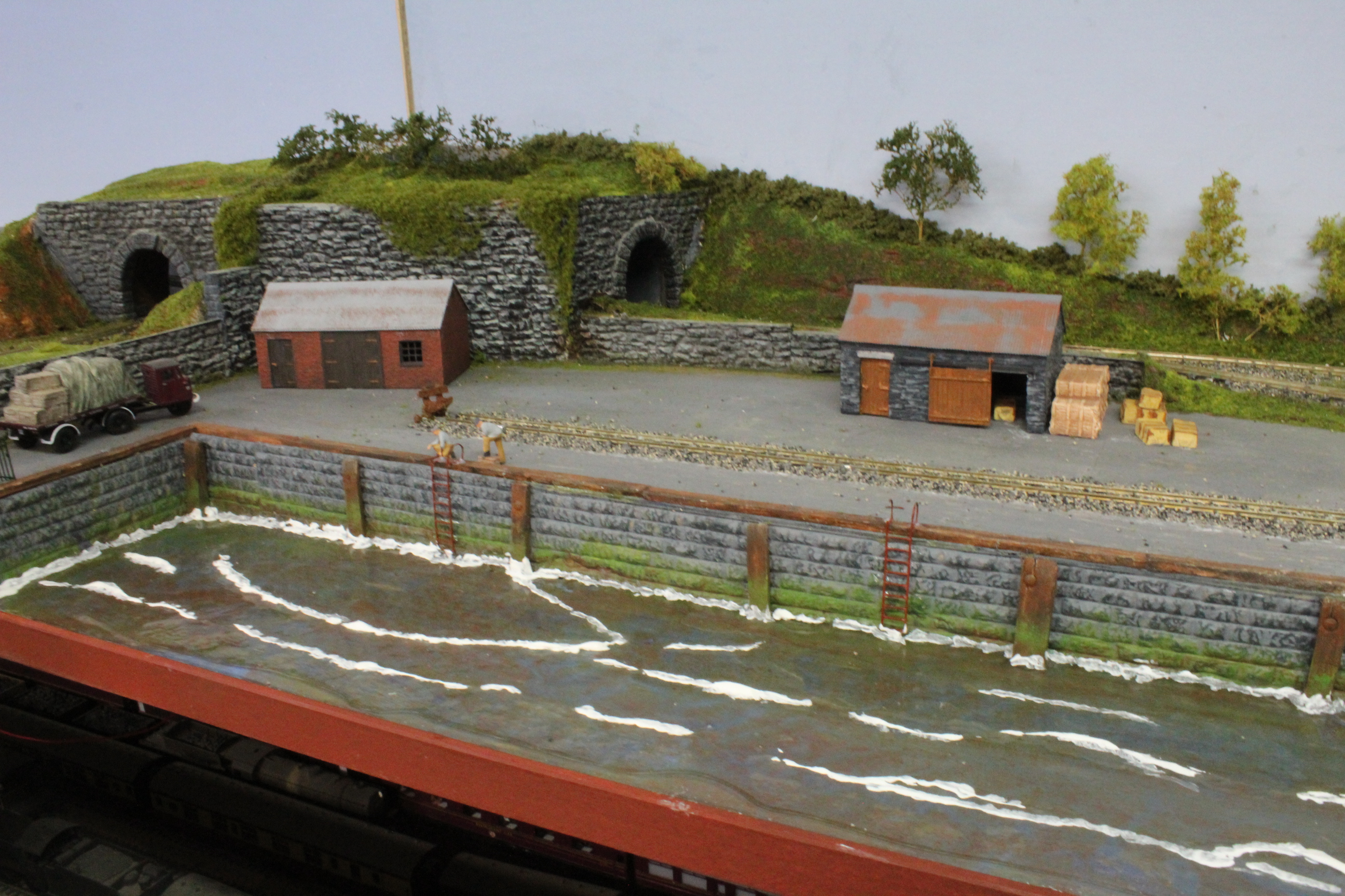 The water effects took some time building up. Firstly water gel was used to build up the waveforms which dries transparent. The waves were then overpainted with water foam mix which had whites and grey paint mixed into it to give it colouring and finally the resin water had the grey-white mix dabbed on with a coarse sponge to show turbulence in the water, ( It’s quite a rough day in my dock today)